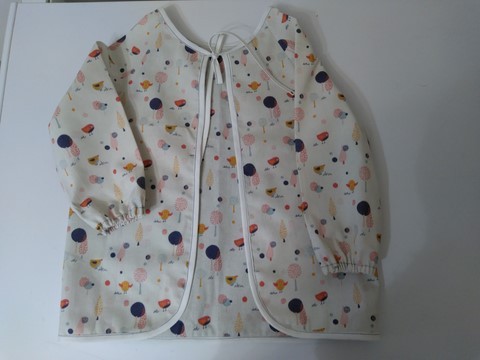 Réalisé en tissu micro éponge de bambou bleu et coton imprimé poussins. Finition biais coton blanc. L'intérieur est doublé coton imprimé poussins. Ce bavoir est aussi un tablier d'activité (pâte à modelé, peinture etc...). Les coutures sont renforcées. Poches sur le devant du bavoir. Fait mains