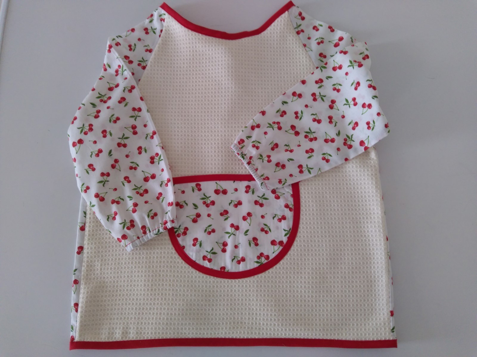 Réalisé en tissu nid d'abeilles écru et coton imprimé cerises rouges. Finition biais coton rouge. Doublure intérieure coton rouge. Ce bavoir est aussi un tablier d'activité (peinture, pâte à modelé etc...). Fait mains.
