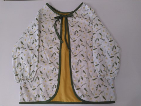 Réalisé en tissu micro éponge de bambou jaune et coton imprimé plumes vertes. Finition biais coton vert. L'intérieur est doublé coton jaune. Ce bavoir est aussi un tablier d'activité (pâte à modelé, peinture etc...). Les coutures sont renforcées. Poches sur le devant du bavoir. Fait mains
