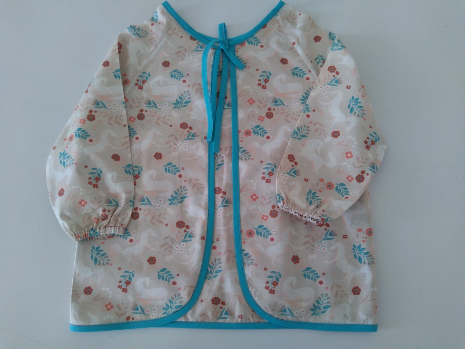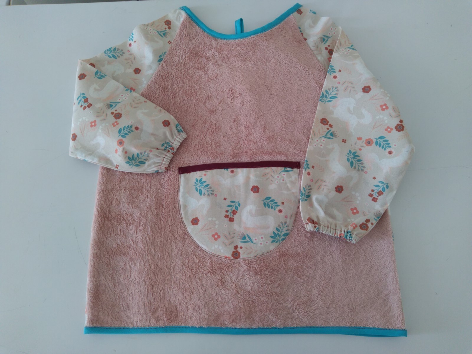 Réalisé en tissu éponge de bambou vieux rose et coton imprimé licornes pour la doublure, le dos et les manches. Finitions biais coton turquoise et bordeaux. Poche appliquée sur le devant du bavoir.Ce bavoir est aussi un tablier d'activité (pâte à modelé, peinture etc...). Fait mains.
