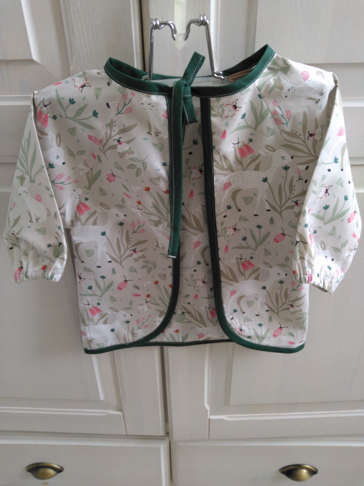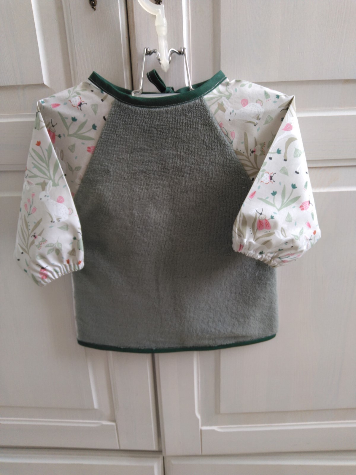 Réalisé dans un tissu éponge de bambou vert et coton imprimé biches vert et rose pour la doublure, le dos et les manches. Finitions biais vert sapin.Ce bavoir est aussi un tablier d'activité (pâte à modelé, peinture etc...). Les coutures sont renforcées. Travail artisanal. Fait mains. 6/18 mois