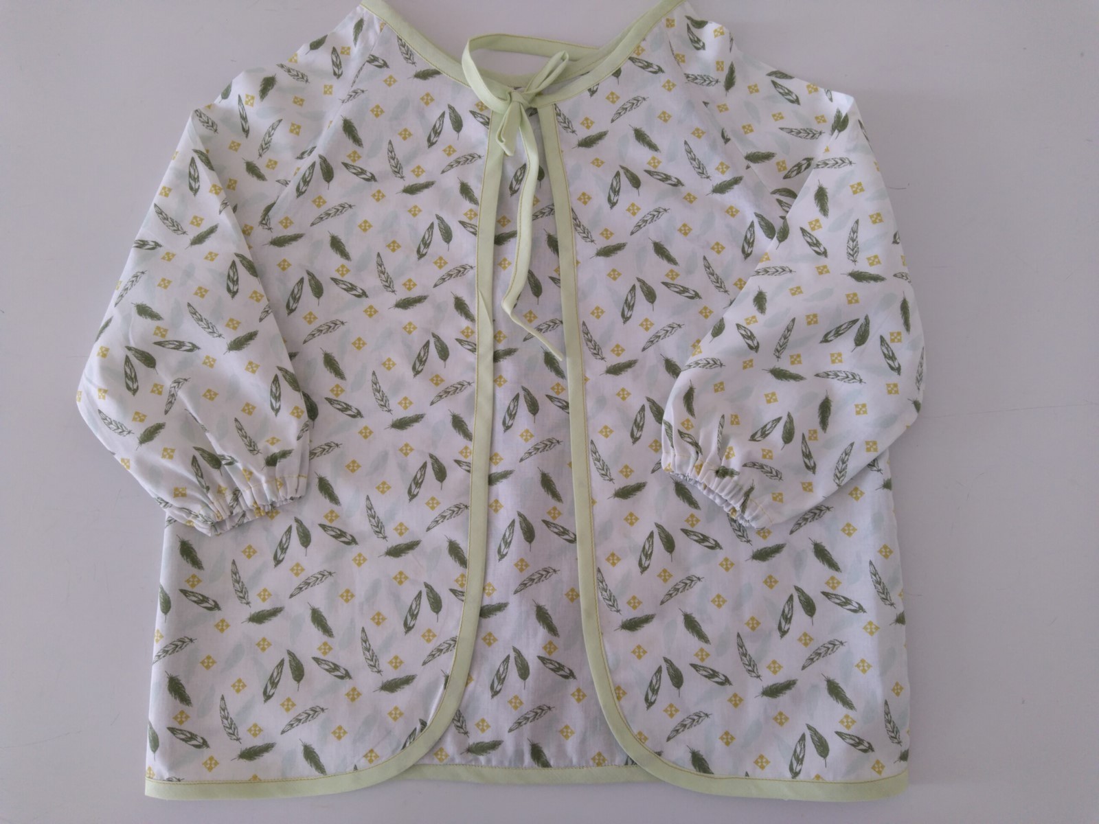 Réalisé en tissu éponge de bambou vert et coton imprimé plumes pour la doublure, le dos et les manches. Finitions biais coton jaune pâle. Poche appliquée sur le devant du bavoir.Ce bavoir est aussi un tablier d'activité (pâte à modelé, peinture etc...). Fait mains.