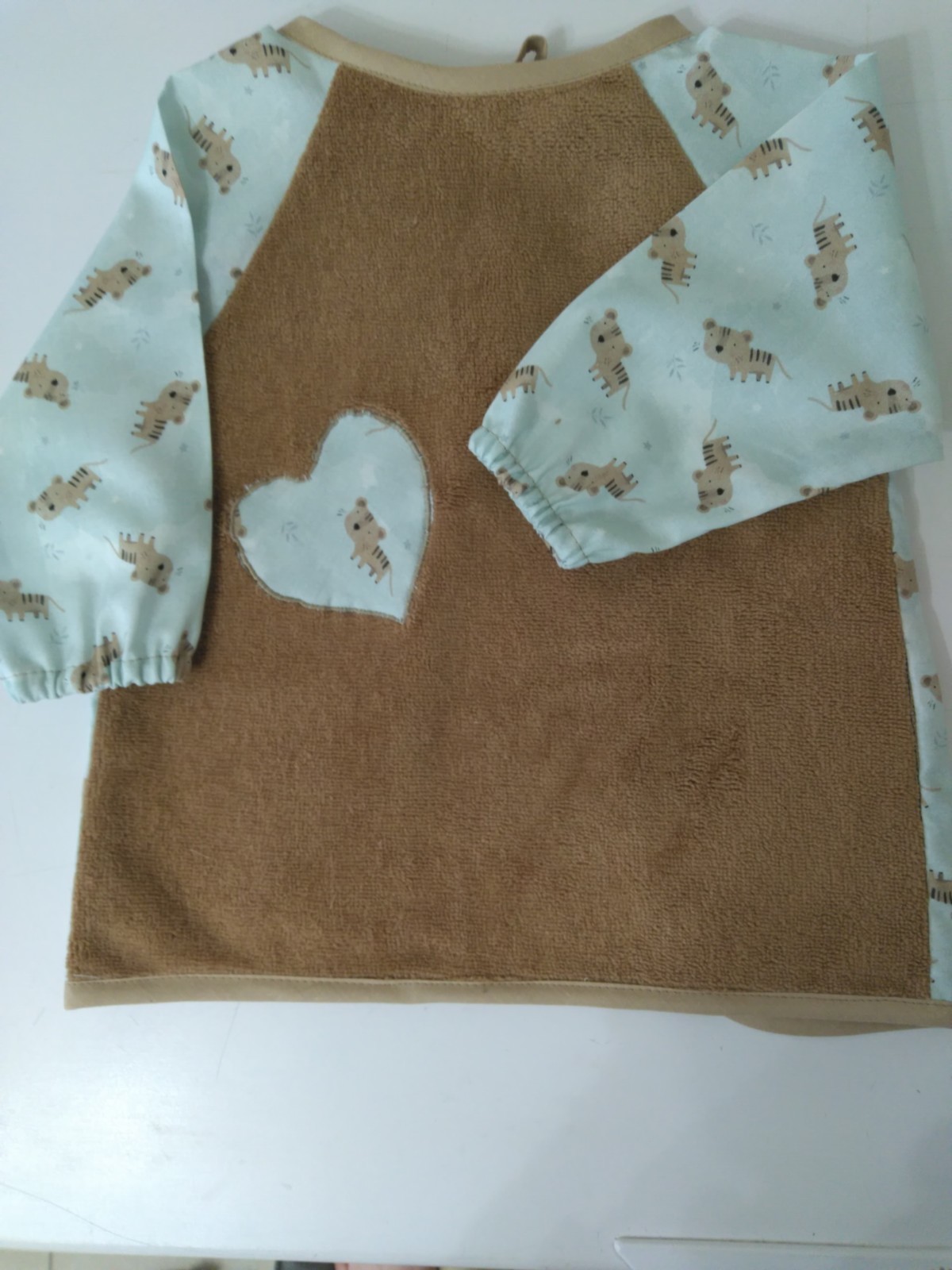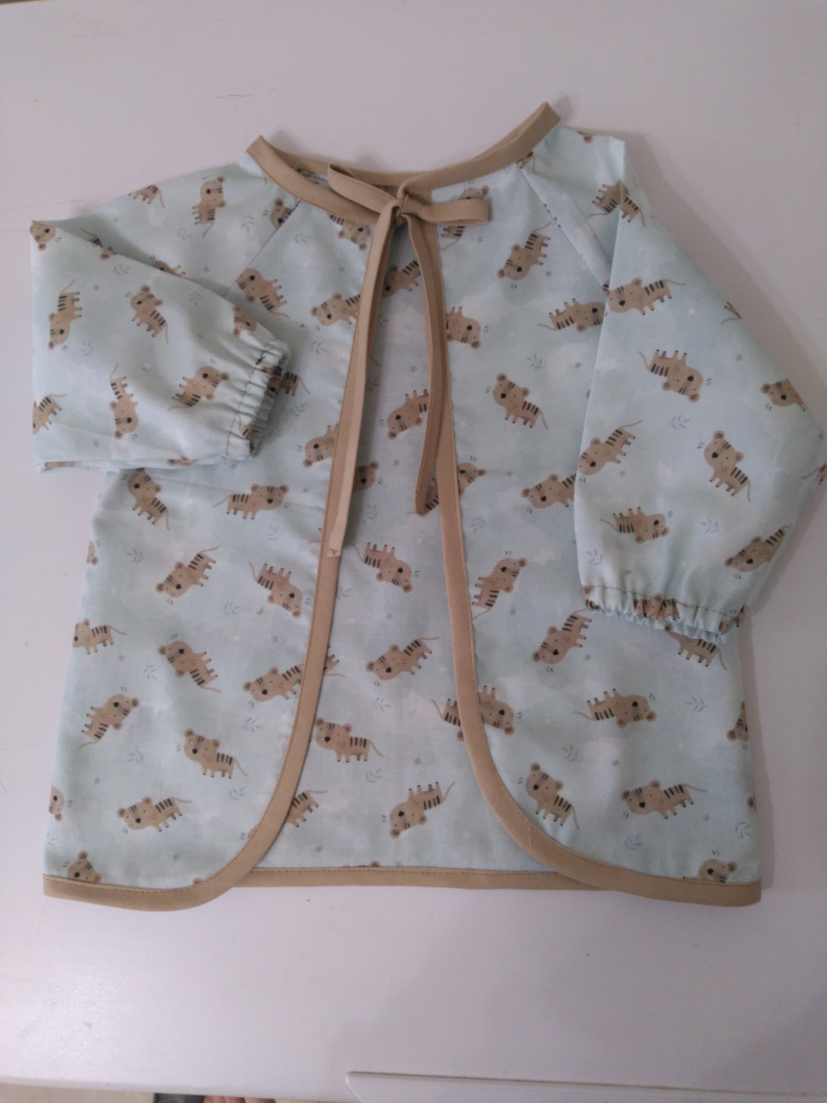 réalisé dans un tissu éponge de bamboucamel et coton imprimé petits chats pour la doublure et les manches. Finition biais coton beige. Ce bavoir est aussi un tablier d'activité (pâte à modelé, peinture etc...). Les coutures sont renforcées. Travail artisanal. Fait mains.