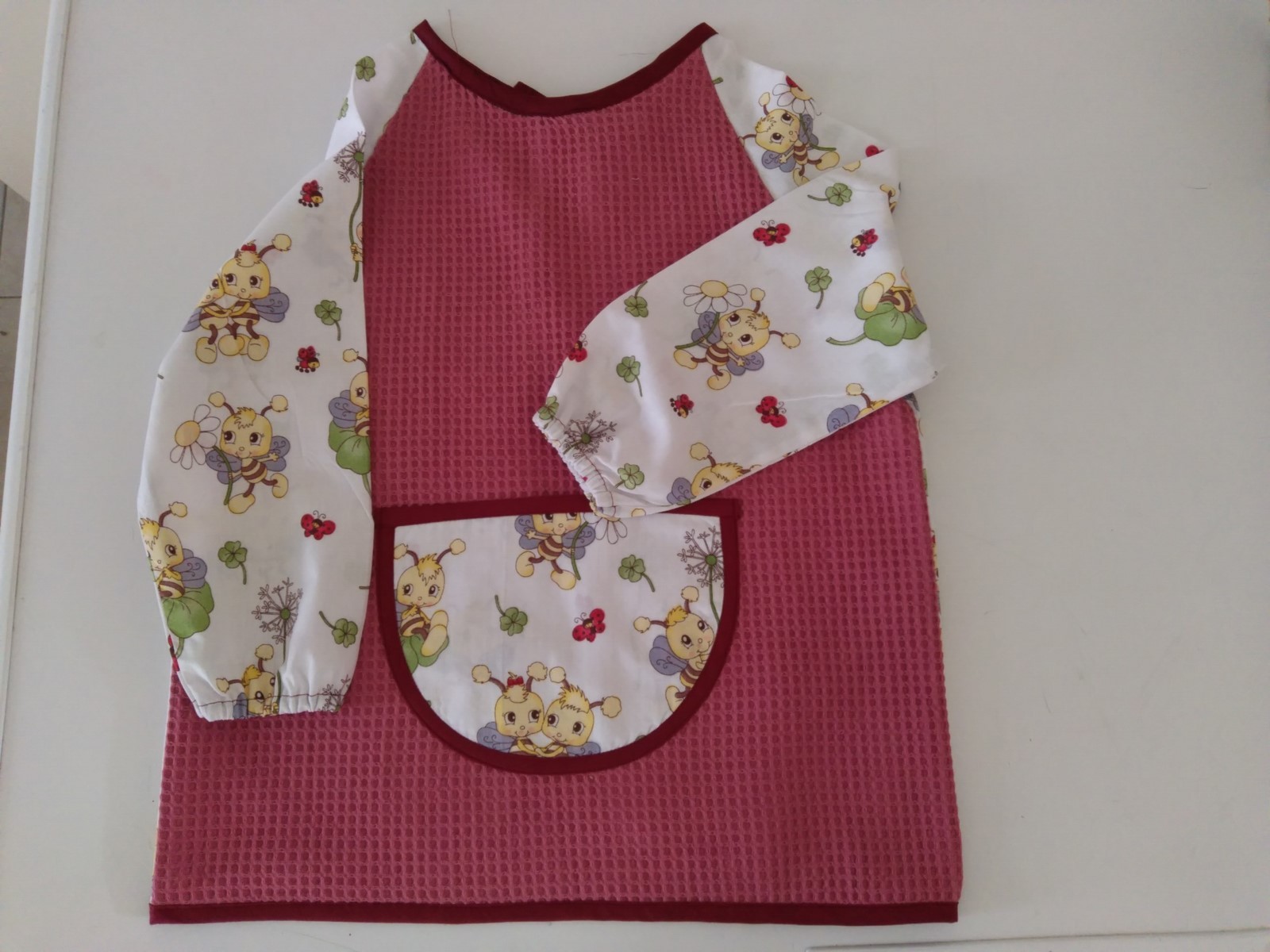 Tissu nid d'abeille framboise et coton imprimé abeilles. Finitions biais bordeaux et poche plaquée sur le devant. peut aussi servir de tablier d'activités (peinture, pâte à modelé...). Doublure coton uni rouge.Coutures renforcées. Travail artisanal. Fait mains.