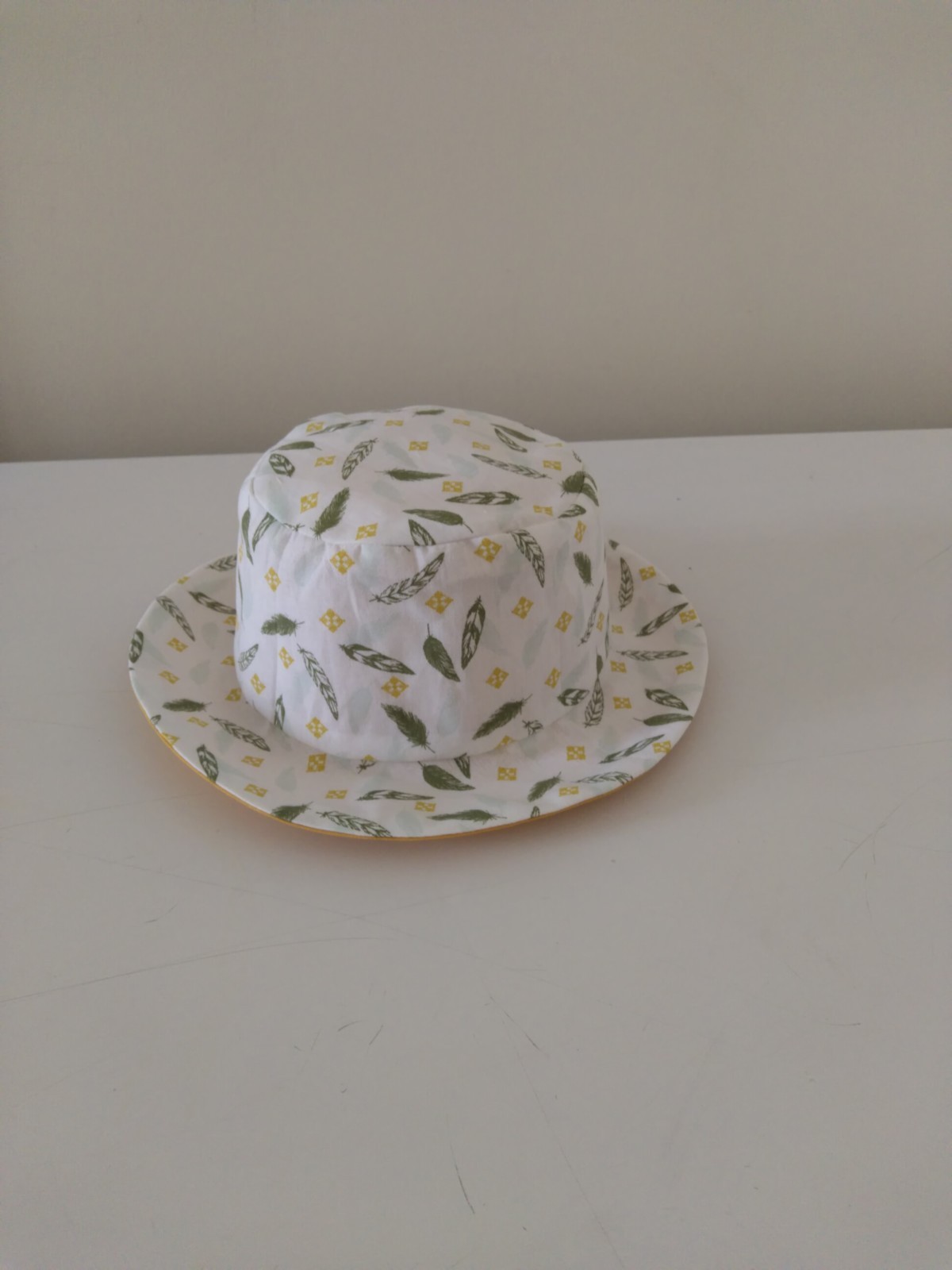 Réalisé en tissu coton imprimé plumes vertes et coton uni jaune moutarde. Les tissus sont certifiés Oeko Tex. Les coutures sont renforcées. Adapté au enfants de 9 mois à 2 ans. travail artisanal. Fait mains