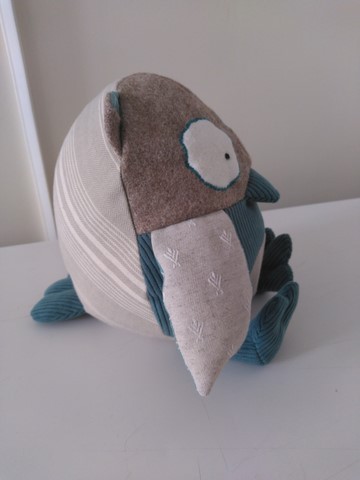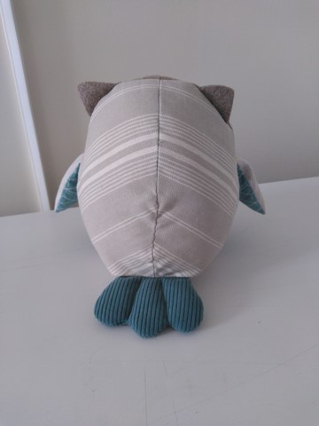 Réalisée en tissus multi-matières (côtelé turquoise, feutre taupe, coutil beige et coton imprimé géométrie bleu et blanc). Yeux appliqués et brodés. Le rembourrage est traité anti acariens et les coutures sont toutes doublées pour plus de solidité. Adapté aux enfants à partir de 18 mois.Travail artisanal. Fait mains.