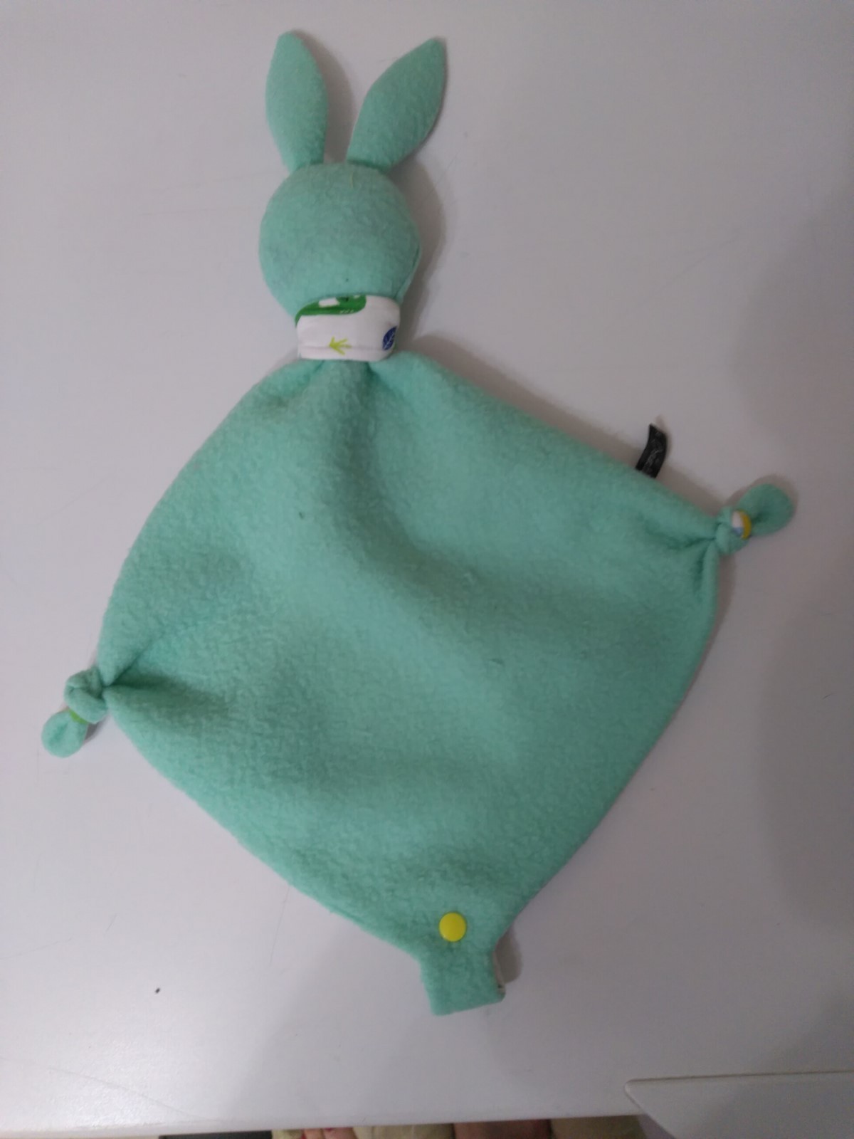 Tissu polaire vert et coton blanc imprimé dinosaures. Le rembourrage est traité anti acariens et les coutures sont doublées pour plus de solidité. Fermeture pour la tétine par bouton pression. Fait mains.