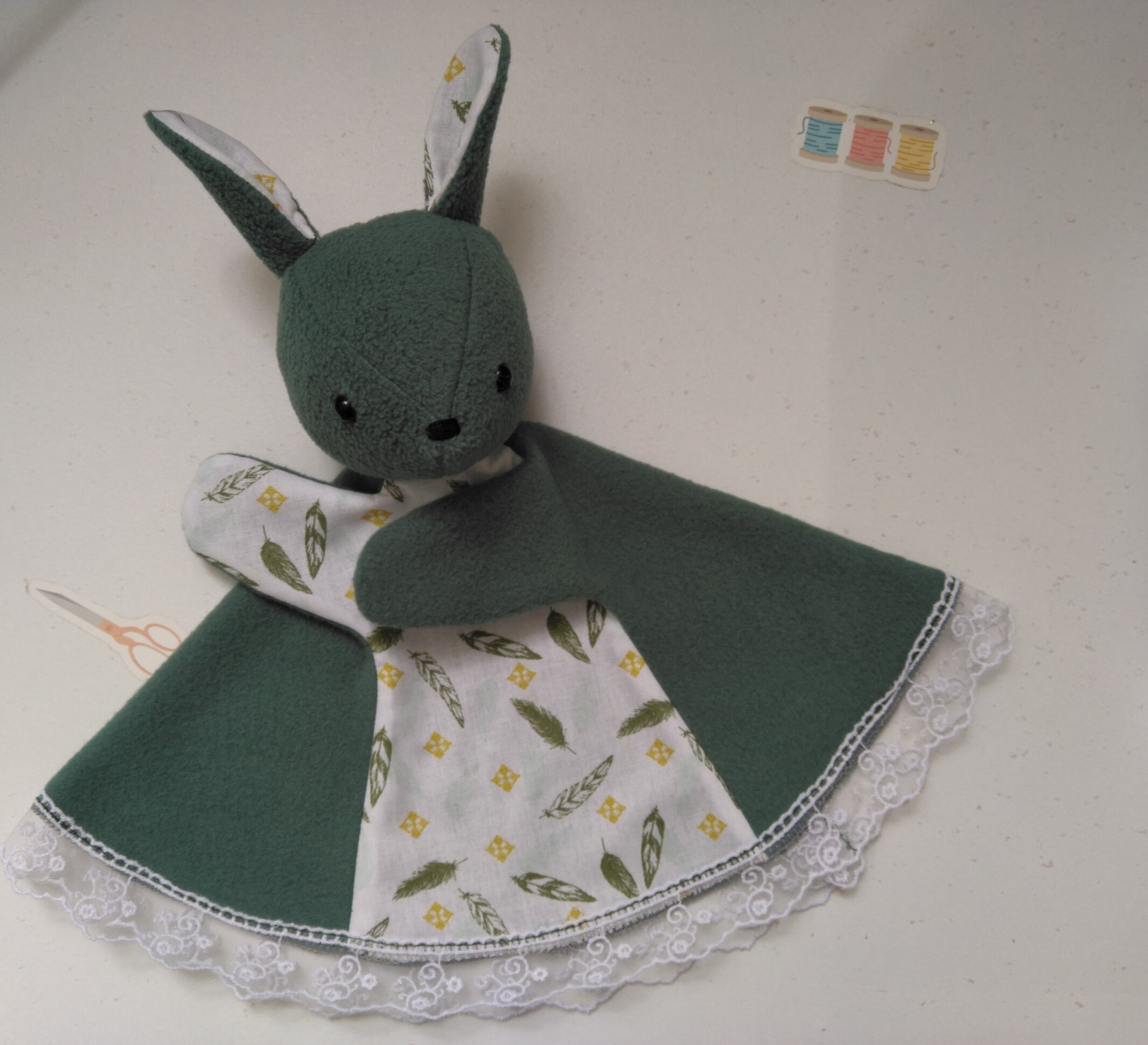 Tissu polaire vert et coton imprimé plumes vertes. Finition dentelle blanche et yeux de sécurité. Les coutures sont doublées pour plus de solidité et le rembourrage de la tête est traité anti acariens. Adapté aux enfants. Fait mains.