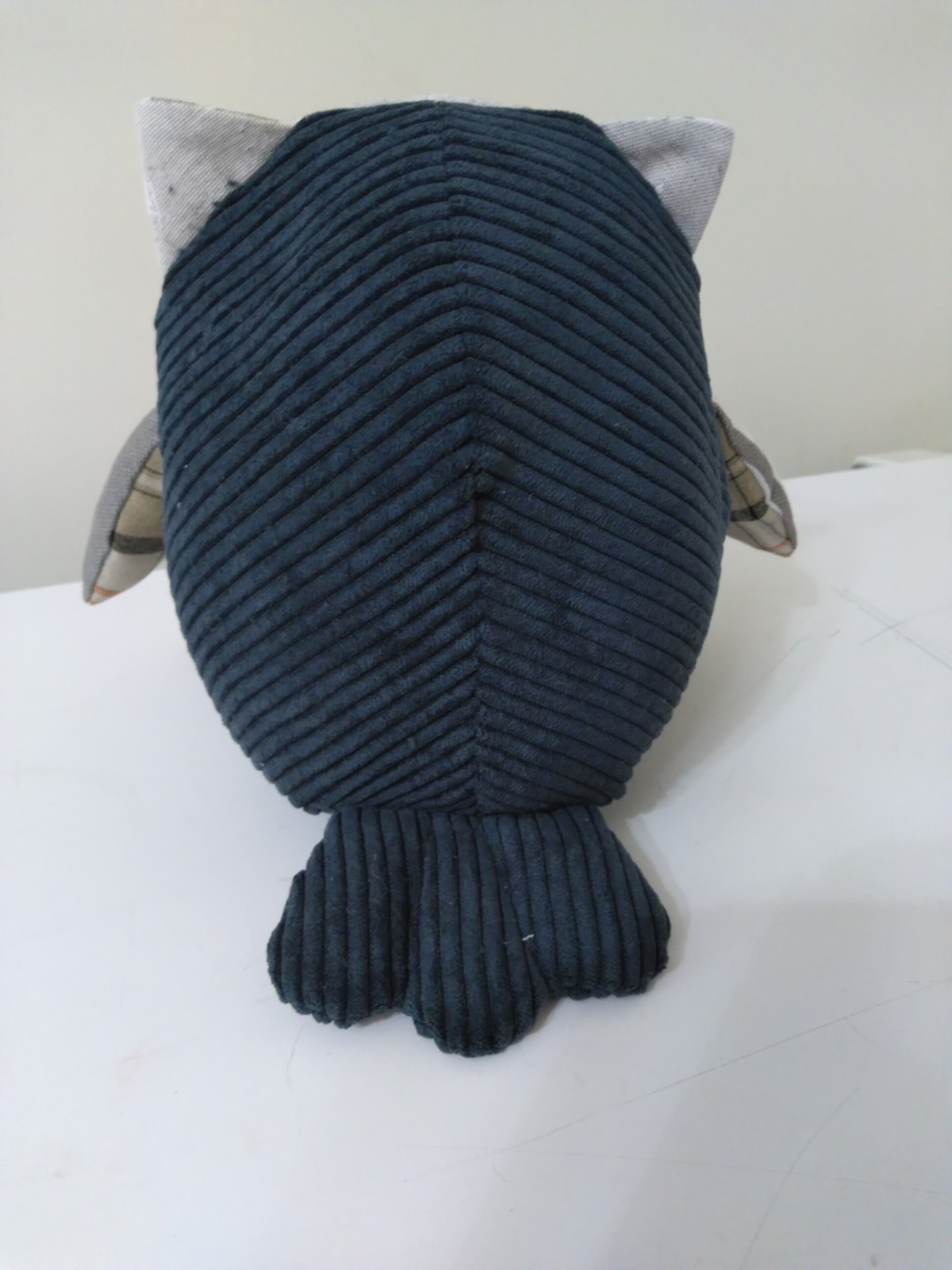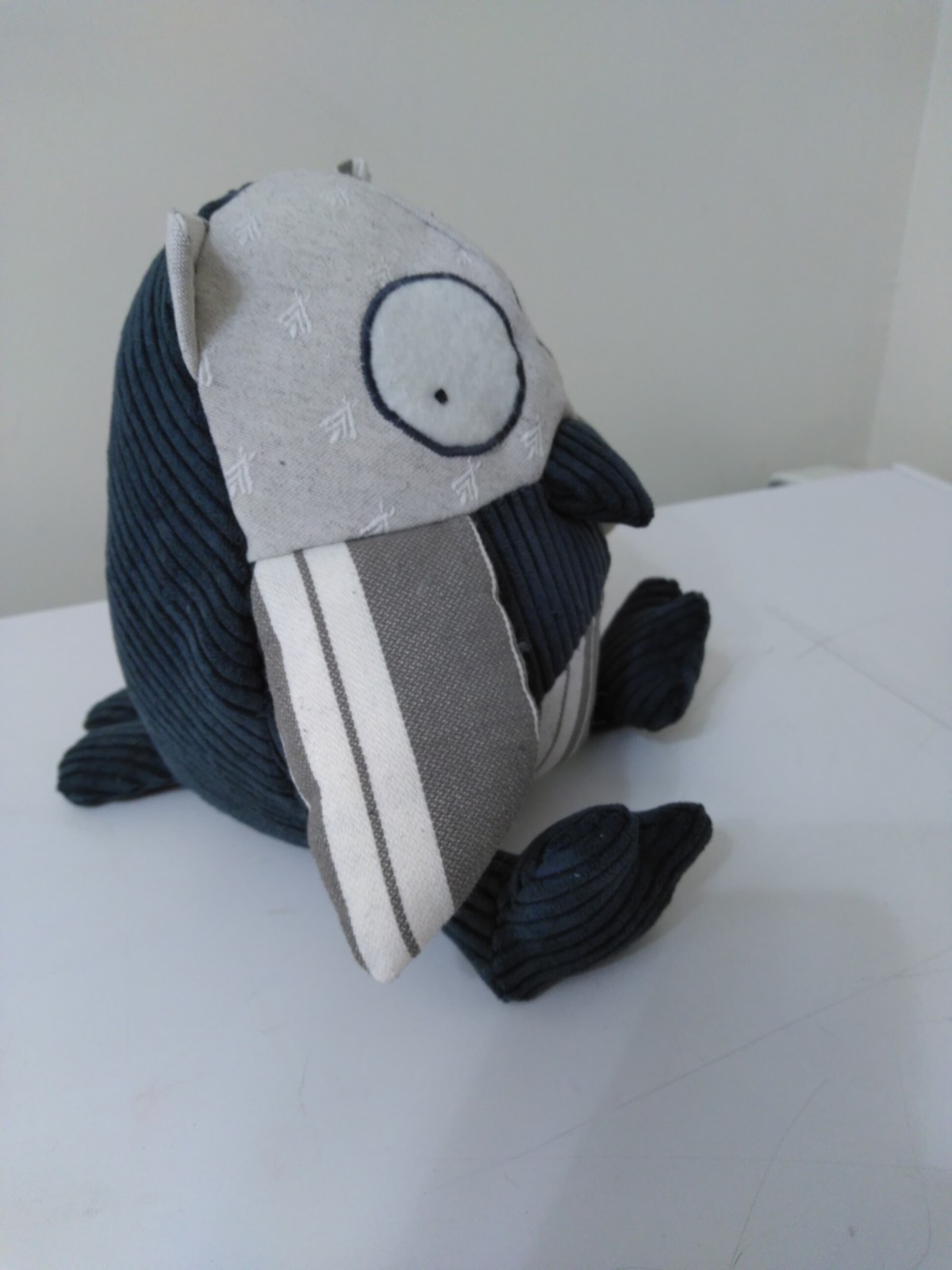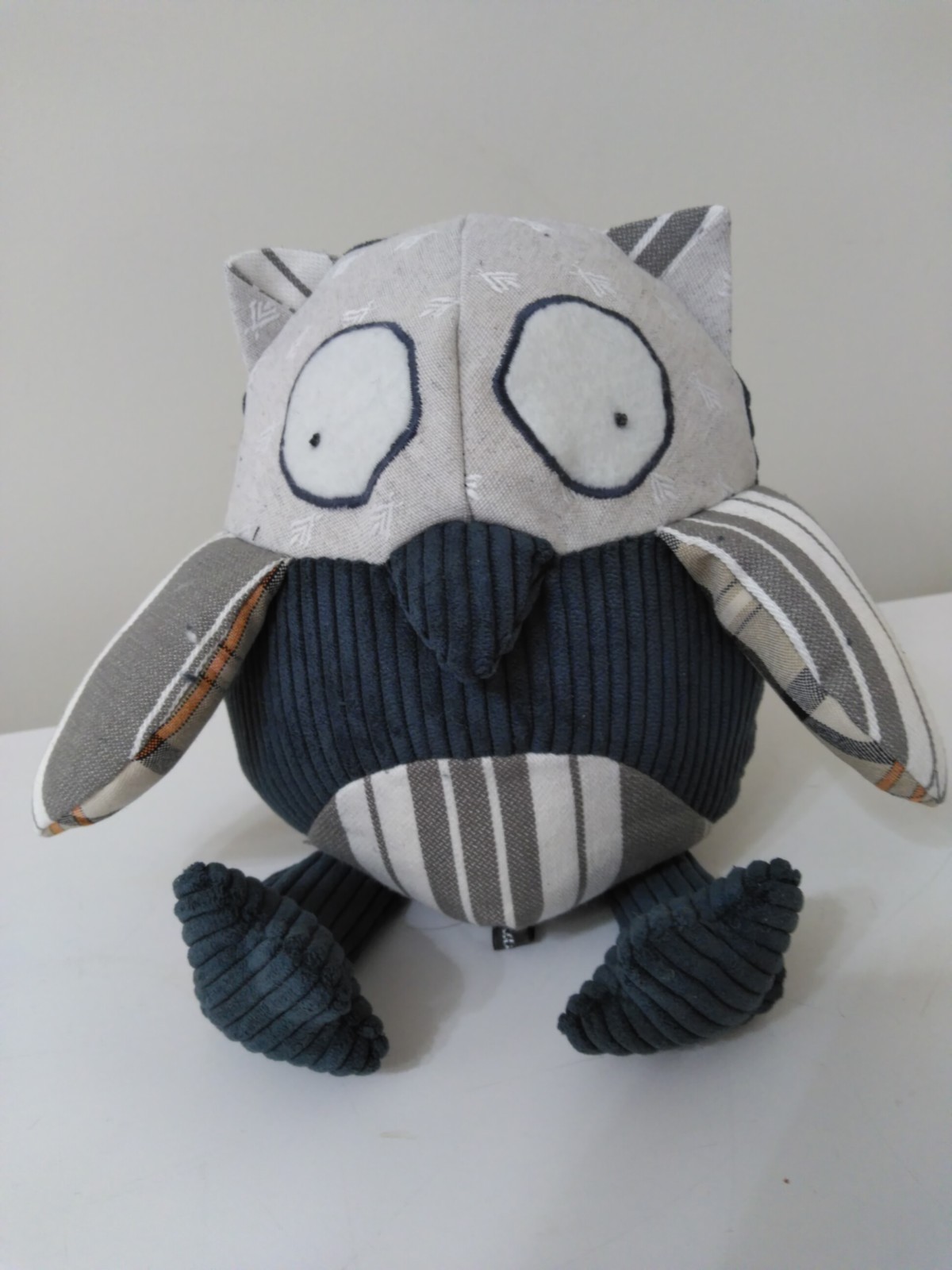 Réalisée en tissu côtelé bleu, jacquard abeilles, canvas naturel, écossais et coutil rayé gris. Le rembourrage est traité anti acariens, les yeux sont appliqués et brodés, les coutures sont doublées pour la solidité. Adapté aux enfants à partir de 18 mois. Travail artisanal. Fait mains