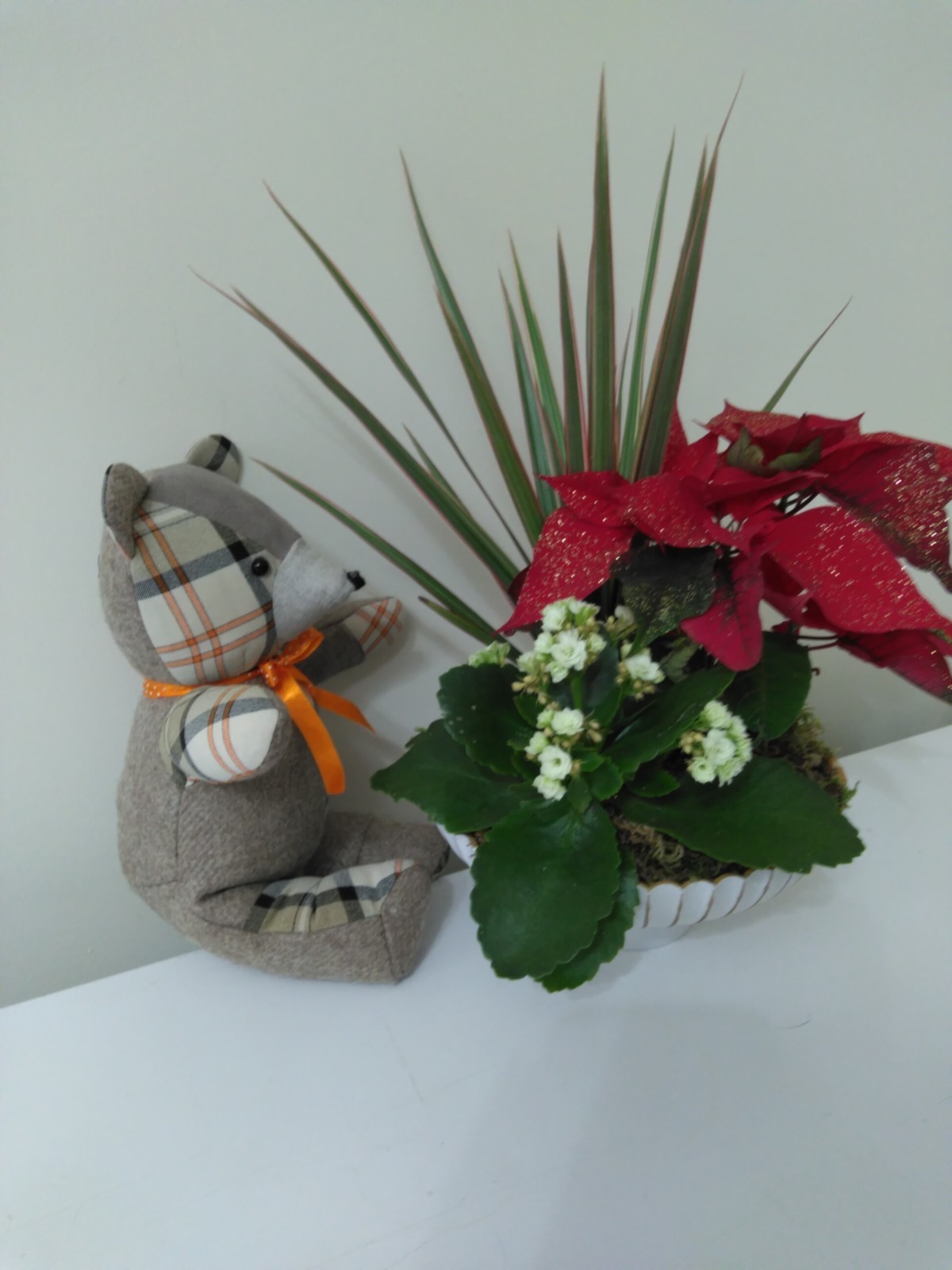 Réalisé en tissus multi-matières (coton écossais, feutrine, suédine et jacquard). Les coutures sont entièrement doublées pour la solidité et la sécurité. Le rembourrage est traité anti-acariens. Les yeux sont des yeux de sécurité. Le nez est brodé. Noeud de satin orange. Adapté aux enfants. Fait mains.