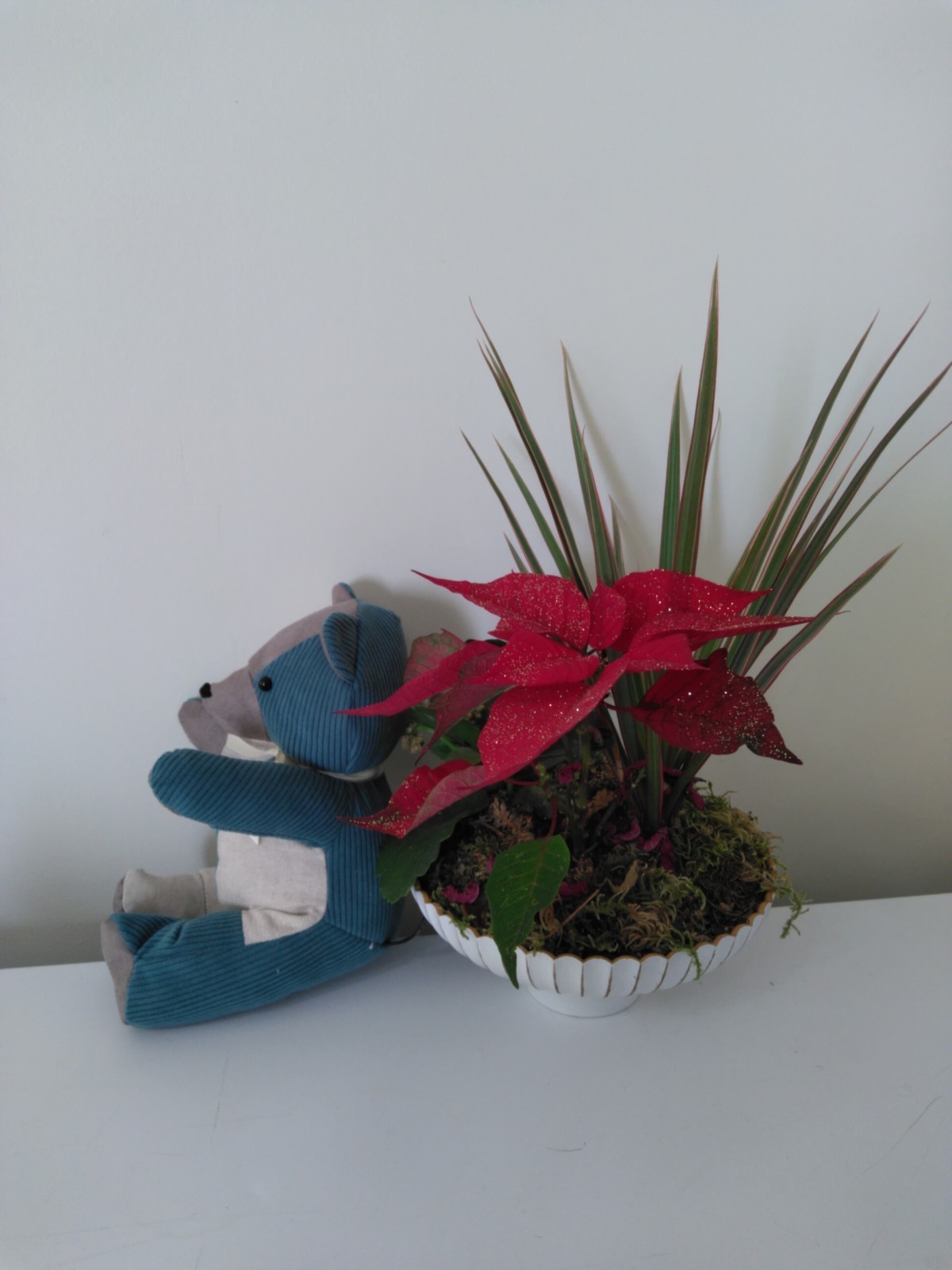 Nounours assis multi-matières velours côtelé bleu