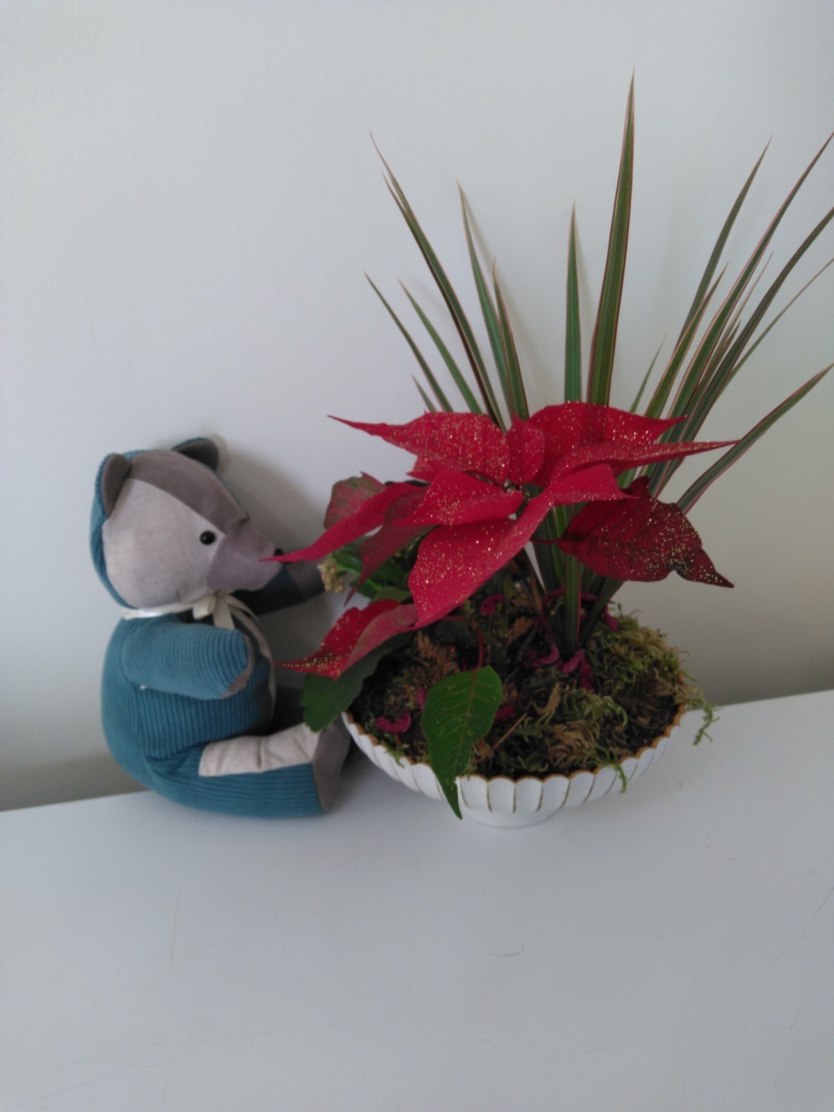 Réalisé avec des tissus velours côtelé, coton, feutrine. Les yeux sont des yeux de sécurité noirs, le nez est brodé et le rembourrage est traité anti acariens. Noeud de satin blanc. Toutes les coutures sont doublées pour la sécurité. Travail artisanal adapté aux enfants. Fait mains.