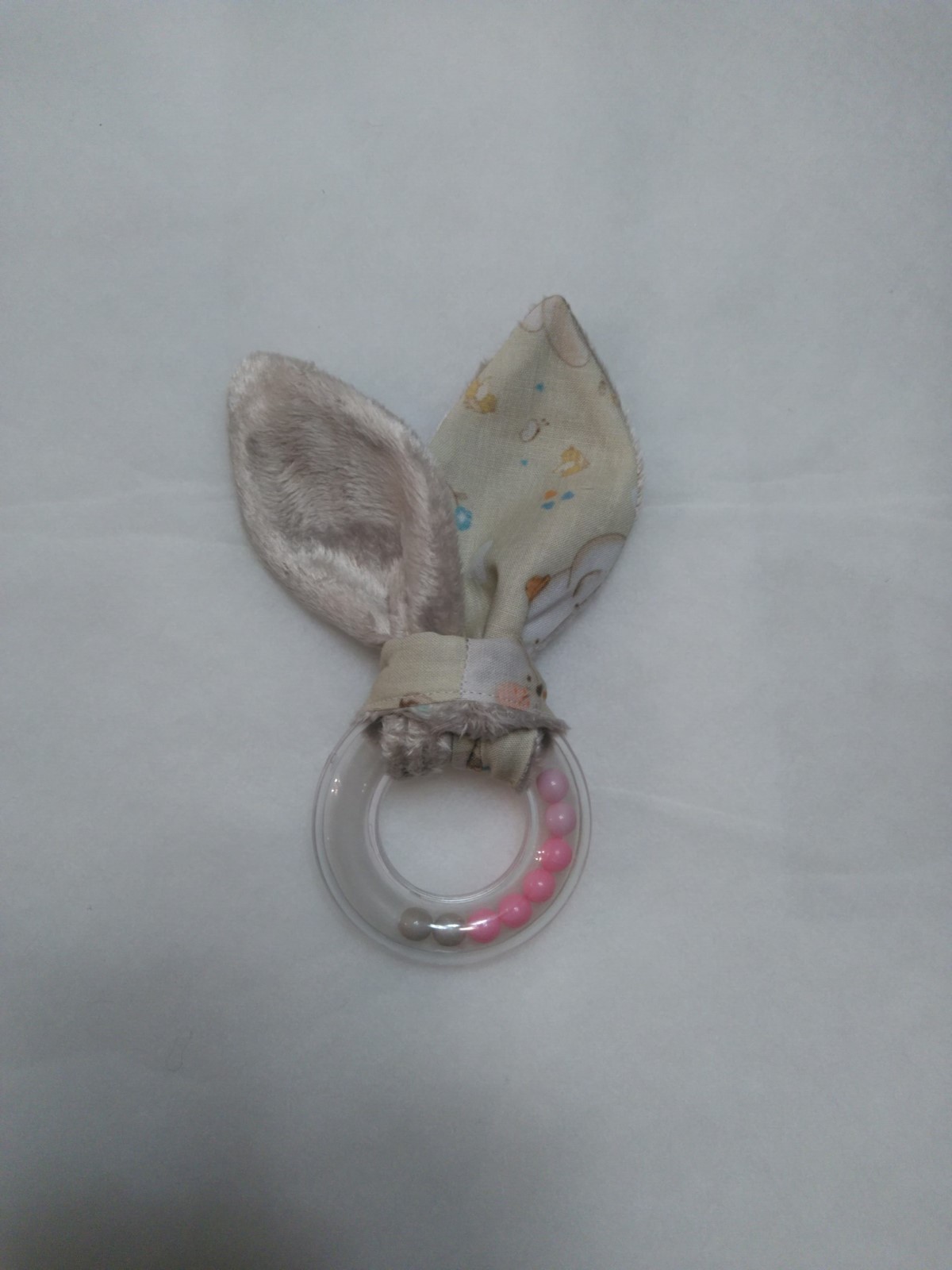 Les oreilles sont réalisées avec du tissu minky beige et coton imprimés éléphants. L'anneau répond aux normes exigées pour la sécurité des enfants. Le certificat peut être consulté sur demande. Adapté aux enfants. Fait mains.