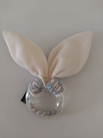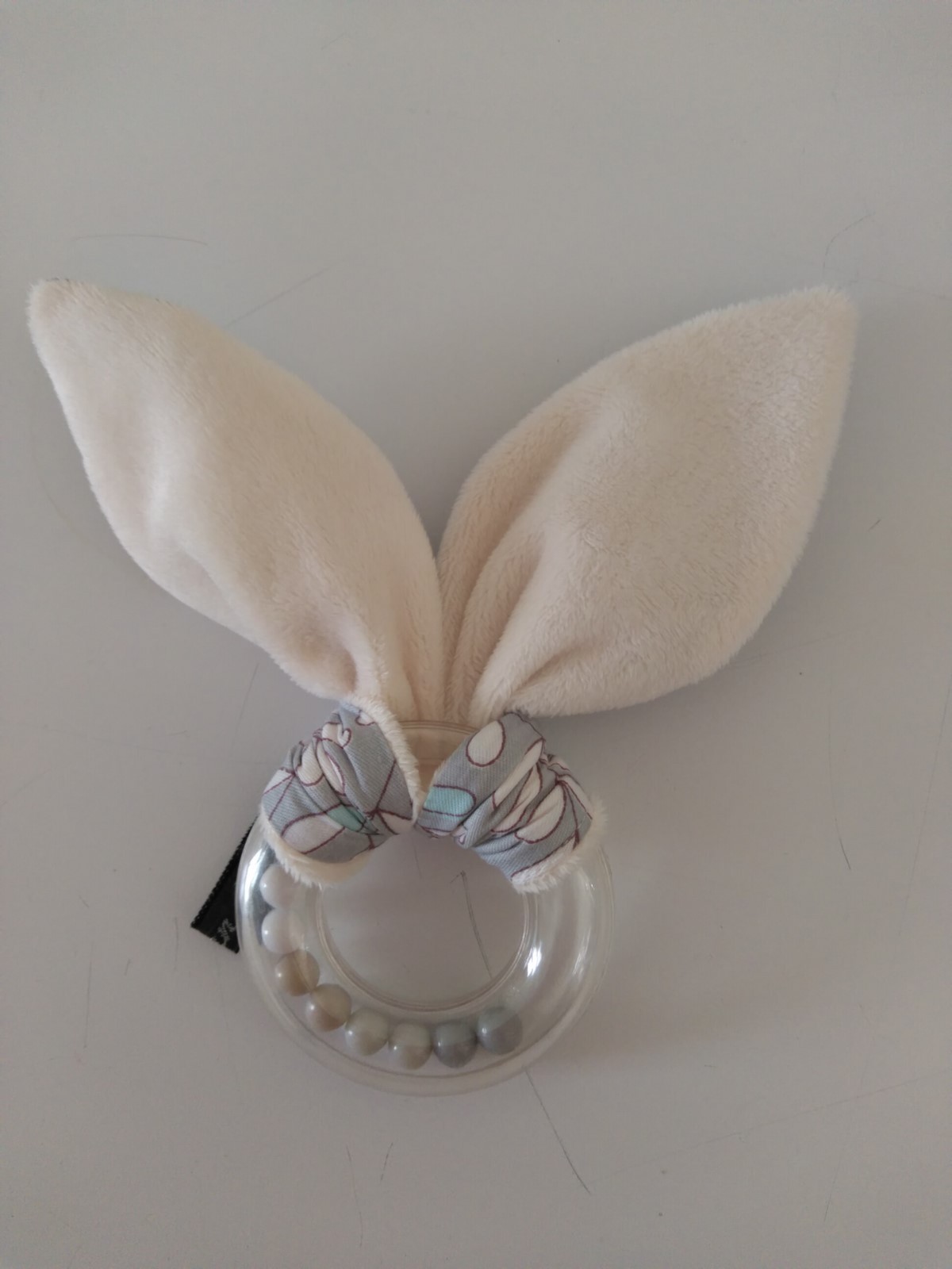 Les oreilles sont réalisées avec du tissu minky écrue et coton imprimé feuilles blanches. L'anneau répond aux normes exigées pour la sécurité des enfants. Le certificat peut être consulté sur demande. Adapté aux enfants. Fait mains.
