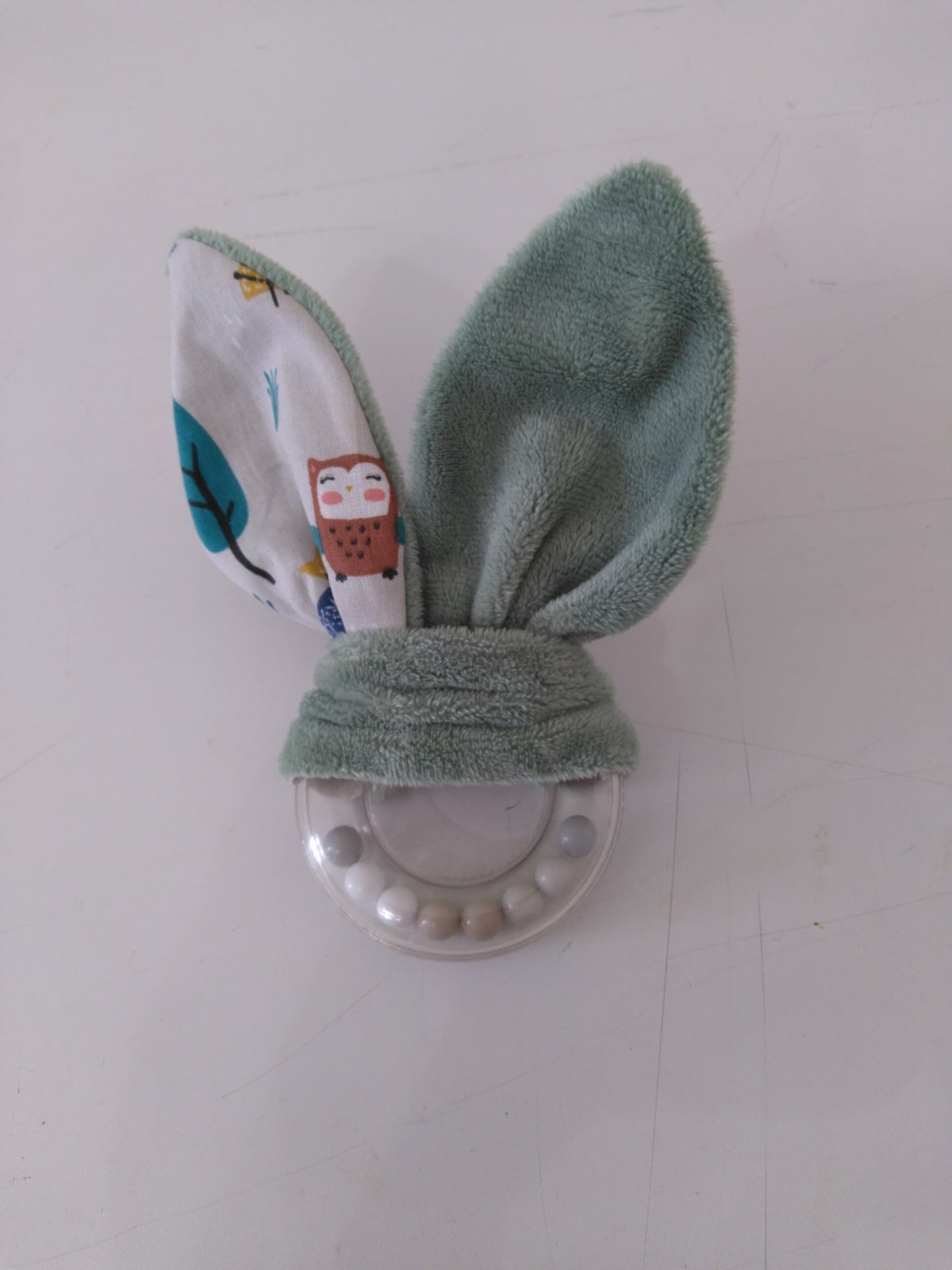 Les oreilles sont réalisées avec du tissu minky vert et coton imprimés animaux. L'anneau répond aux normes exigées pour la sécurité des enfants. Le certificat peut être consulté sur demande. Adapté aux enfants. Fait mains.