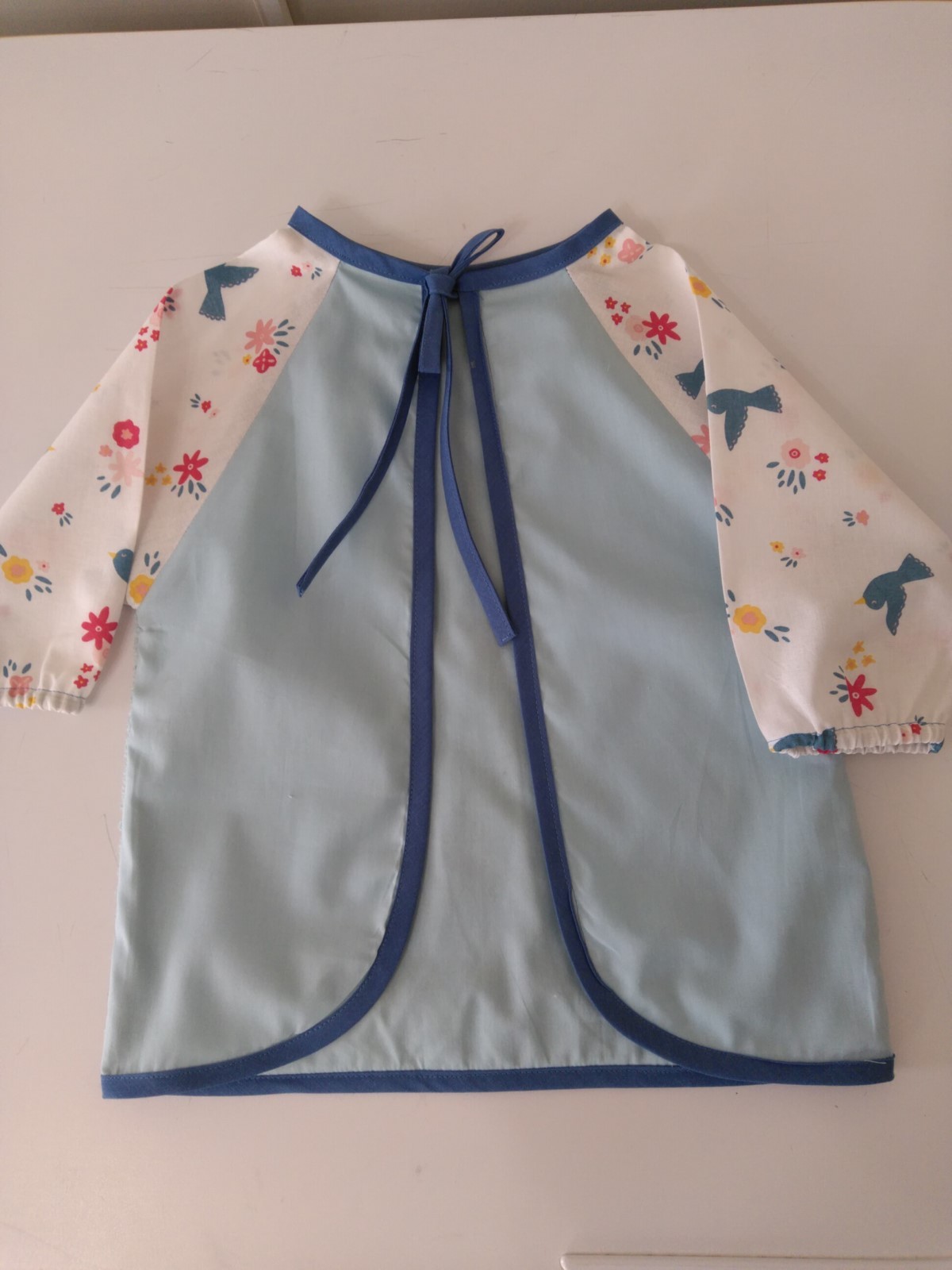 Tissu éponge bleu, coton imprimé oiseaux bleus. Finition biais bleu, petits coeurs en appliqué sur le devant. Les coutures sont renforcées pour plus de solidité. Doublure coton bleu. Peut aussi servir de tablier d'activité (peinture, pâte à modelé). Travail artisanal. Fait mains.