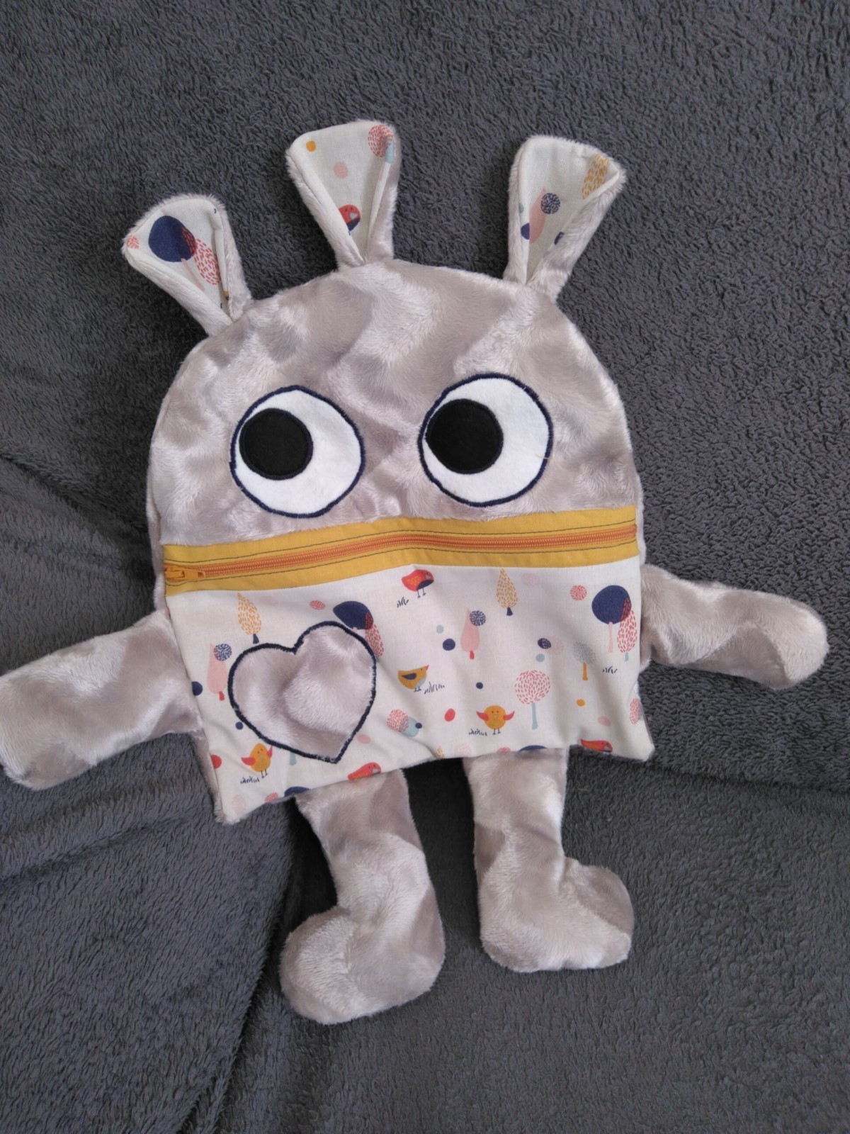 Tu as un chagrin, tes parents t'ont puni ou fâché, tu t'es fait mal etc...tu écris ton problème ou tu le dessines et tu le donne à manger à ton compagnon. Hop! plus de chagrin, il a tout mangé. plus qu'un doudou il sera un compagnon idéal pour te consoler.Mange soucis minky beige, coton imprimé poussins. Doublure coton jaune. Un zip jaune ferme la bouche. Les yeux sont en appliqué. Les coutures sont renforcées pour plus de solidité. Adapté aux enfants. Fait mains