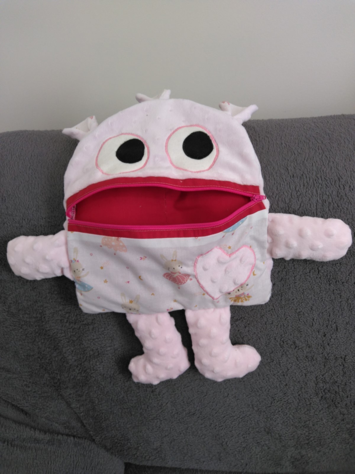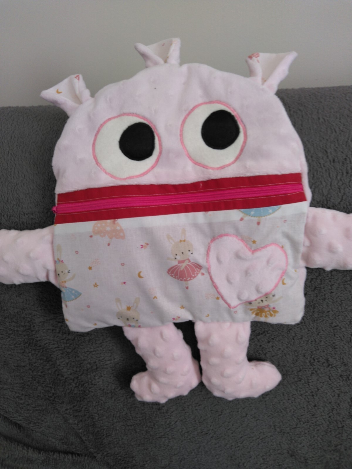 Tu as un chagrin, tes parents t'ont puni ou fâché, tu t'es fait mal etc...tu écris ton problème ou tu le dessines et tu le donne à manger à ton compagnon. Hop! plus de chagrin, il a tout mangé. plus qu'un doudou il sera un compagnon idéal pour te consoler.Mange soucis minky rose, coton imprimé lapins danseurs. Doublure coton rouge. Un zip rouge ferme la bouche. Les yeux et le petit coeur devant sont en appliqué. Les coutures sont renforcées pour plus de solidité. Adapté aux enfants. Fait mains
