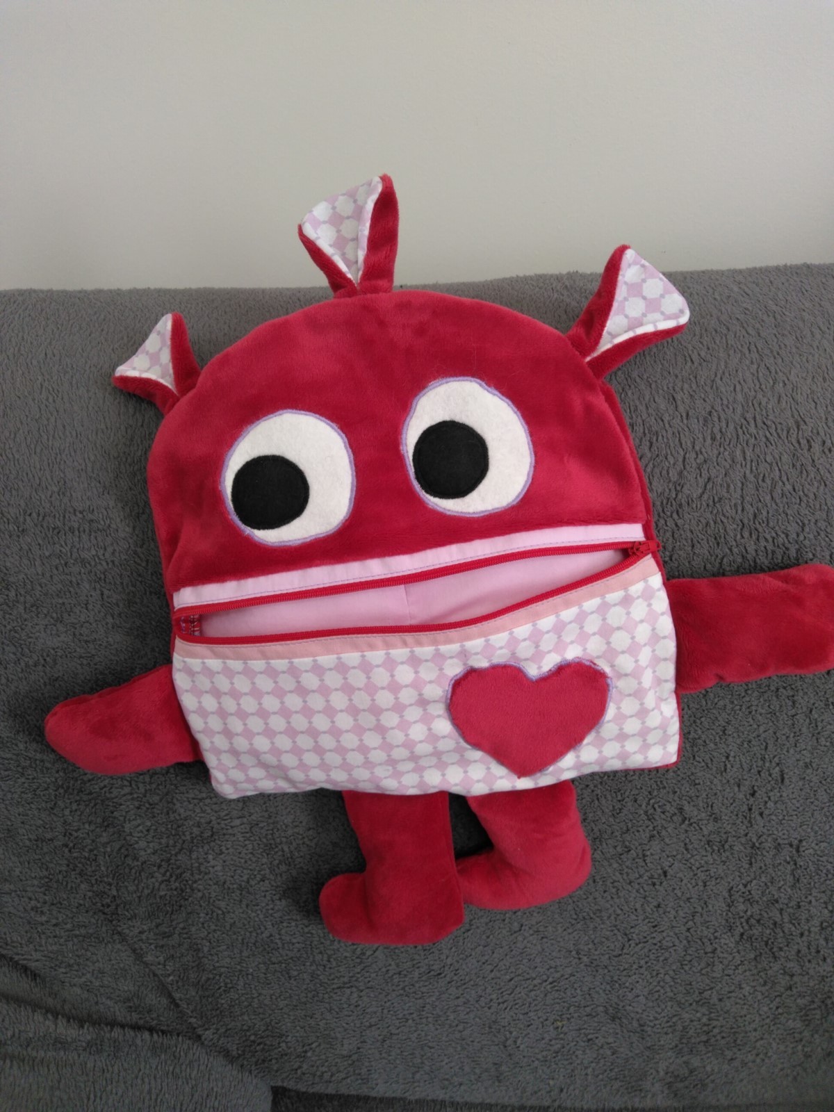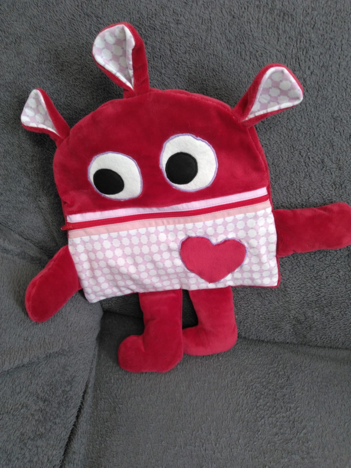Tu as un chagrin, tes parents t'ont puni ou fâché, tu t'es fait mal etc...tu écris ton problème ou tu le dessines et tu le donne à manger à ton compagnon. Hop! plus de chagrin, il a tout mangé. plus qu'un doudou il sera un compagnon idéal pour te consoler.Mange soucis minky rouge, coton géométrie rose et blanc. Doublure coton rose. Un zip rouge ferme la bouche. Les yeux et le petit coeur devant sont en appliqué. Les coutures sont renforcées pour plus de solidité. Adapté aux enfants. Fait mains.