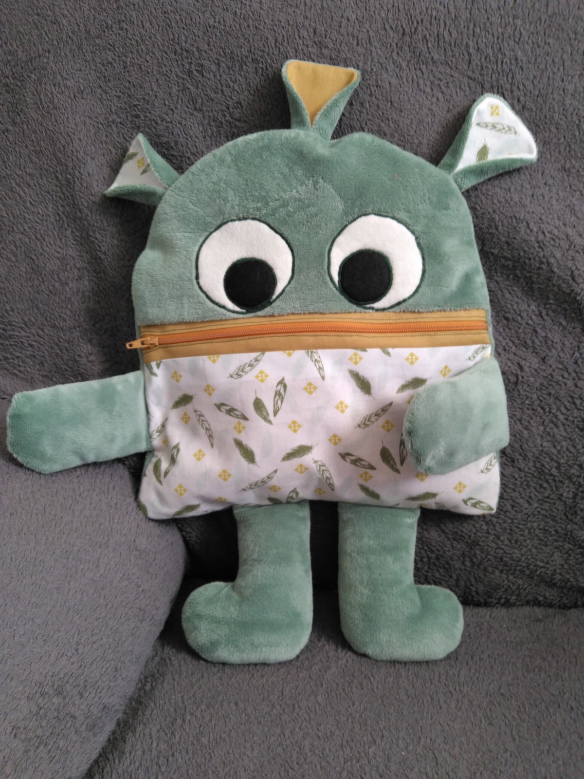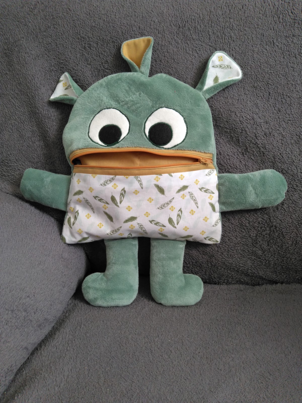 Tu as un chagrin, tes parents t'ont puni ou fâché, tu t'es fait mal etc...tu écris ton problème ou tu le dessines et tu le donne à manger à ton compagnon. Hop! plus de chagrin, il a tout mangé. plus qu'un doudou il sera un compagnon idéal pour te consoler.Mange soucis minky vert, coton imprimé plumes. Doublure coton jaune moutarde. Un zip jaune ferme la bouche. Les yeux sont en appliqué. Les coutures sont renforcées pour plus de solidité. Adapté aux enfants. Fait mains.