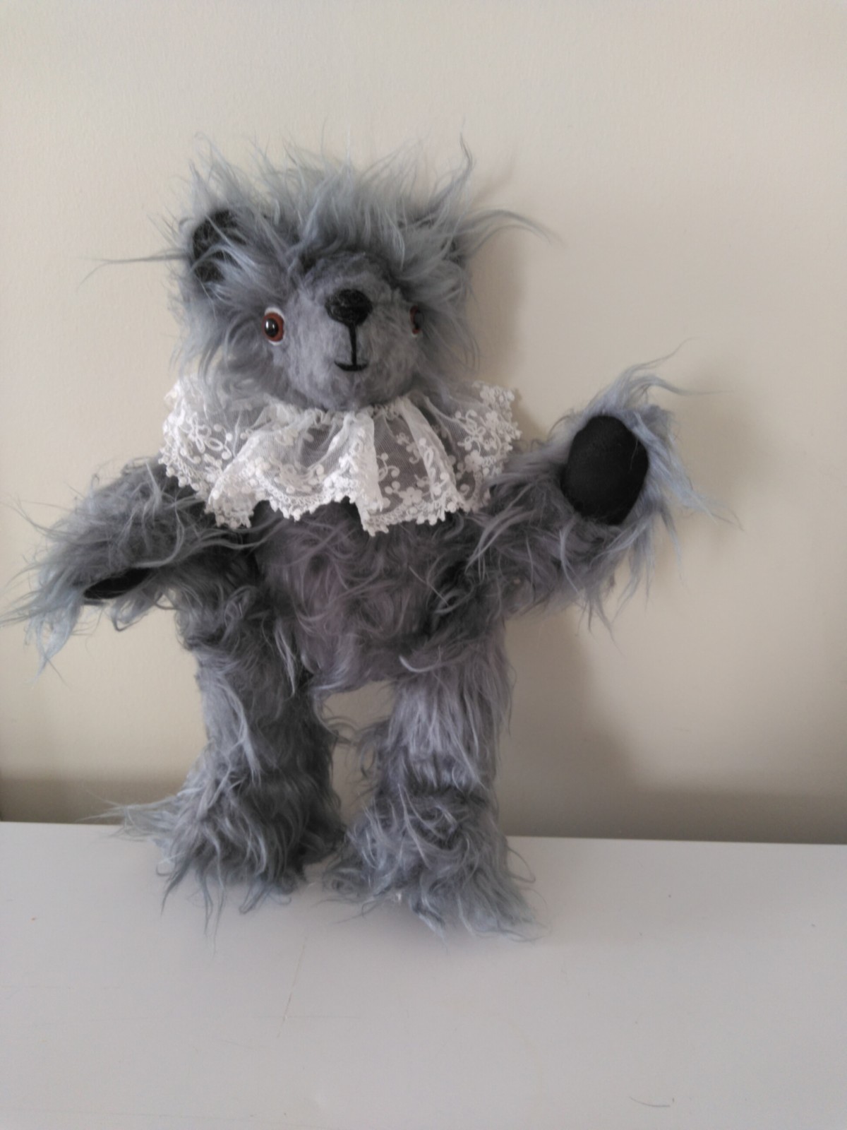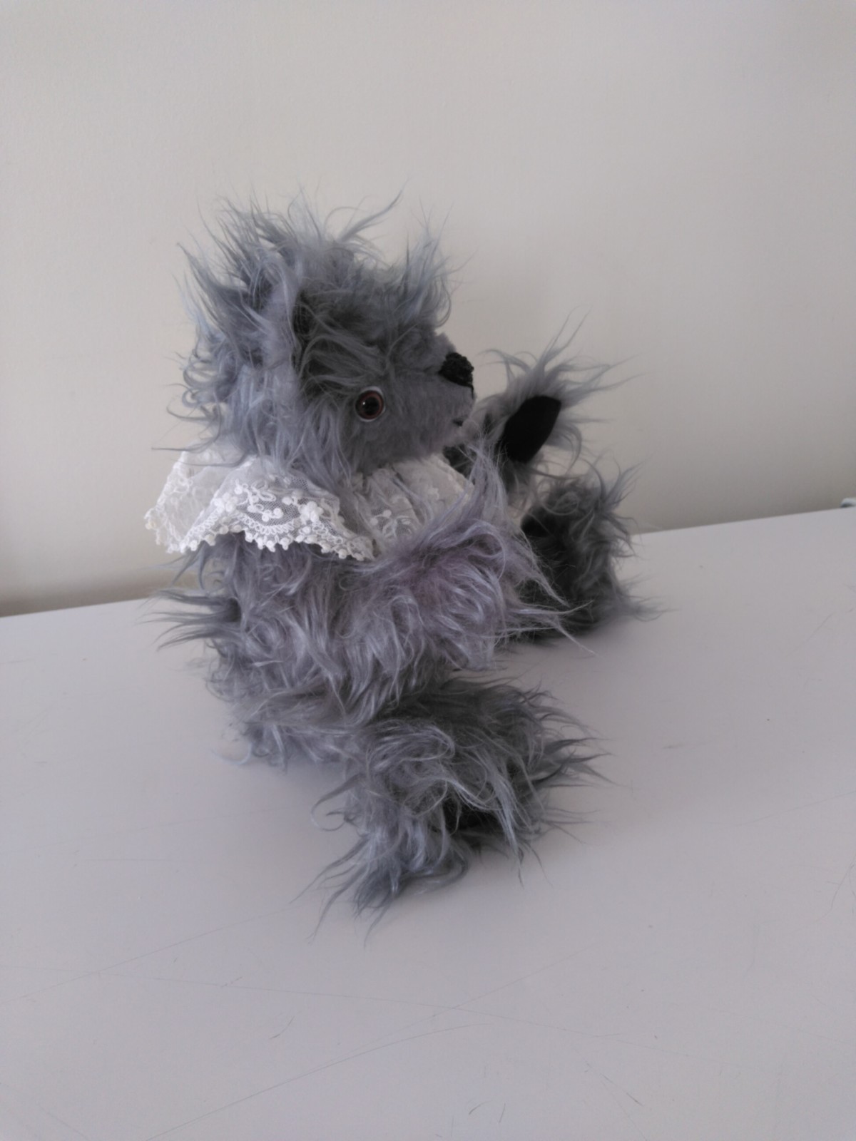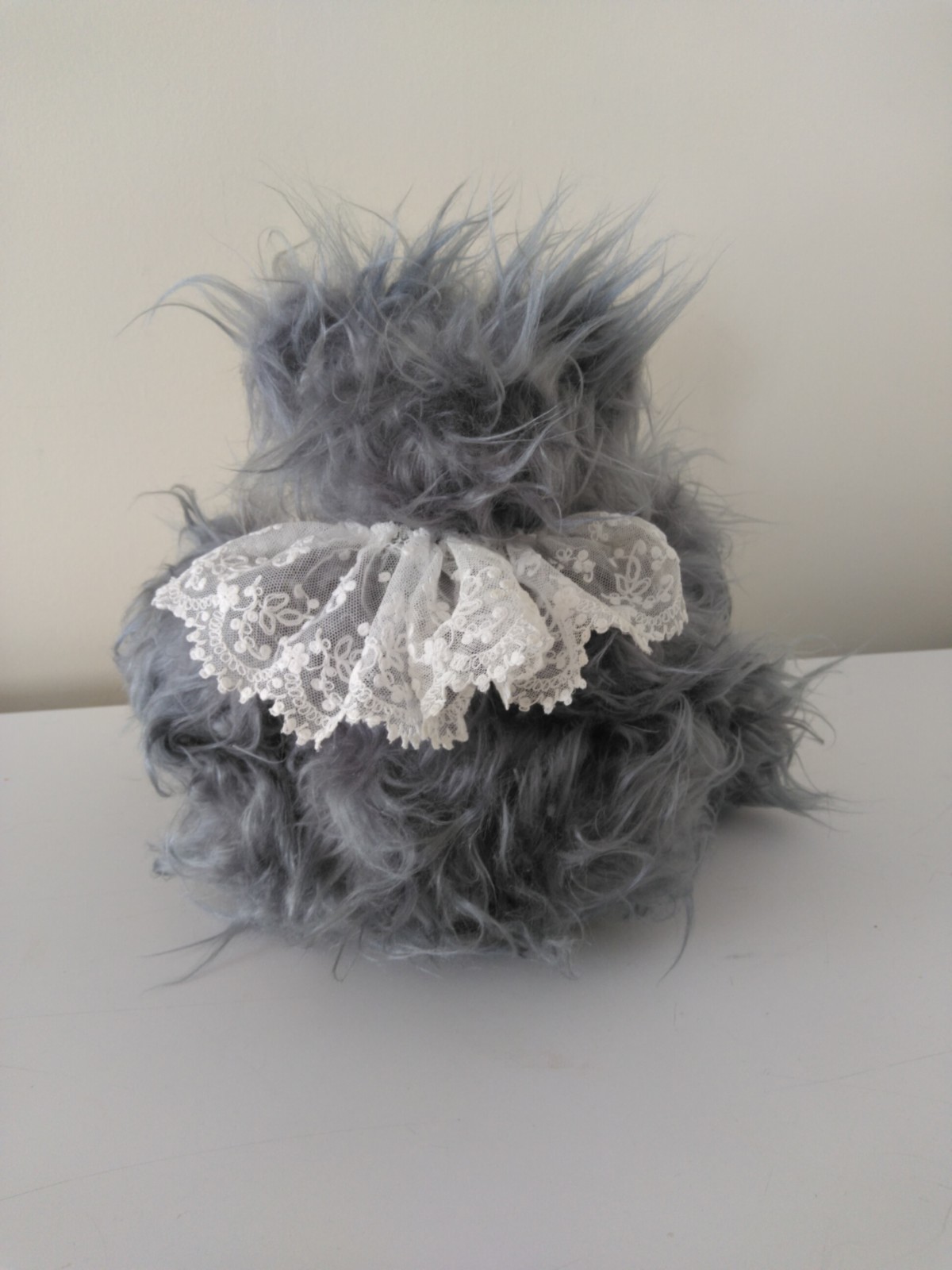 Réalisé à l'ancienne en tissu mohair gris à poils longs et suédine noir de qualité pour les oreilles et l'intérieur des pattes. Entièrement articulé, rembourrage traité anti acariens. Une petite collerette en dentelle ancienne pour agrémenter l'ensemble. Yeux de sécurité et coutures renforcées. Cet ours est entièrement fait à la main de façon artisanal.