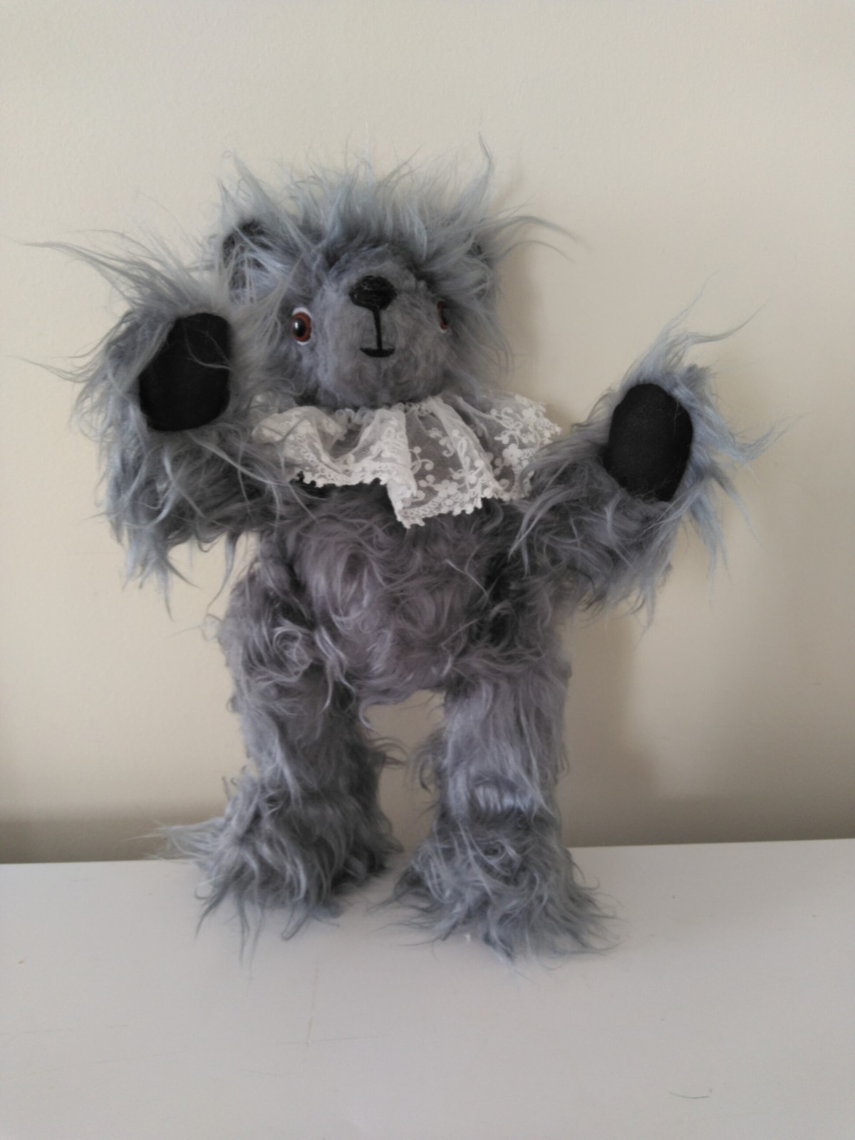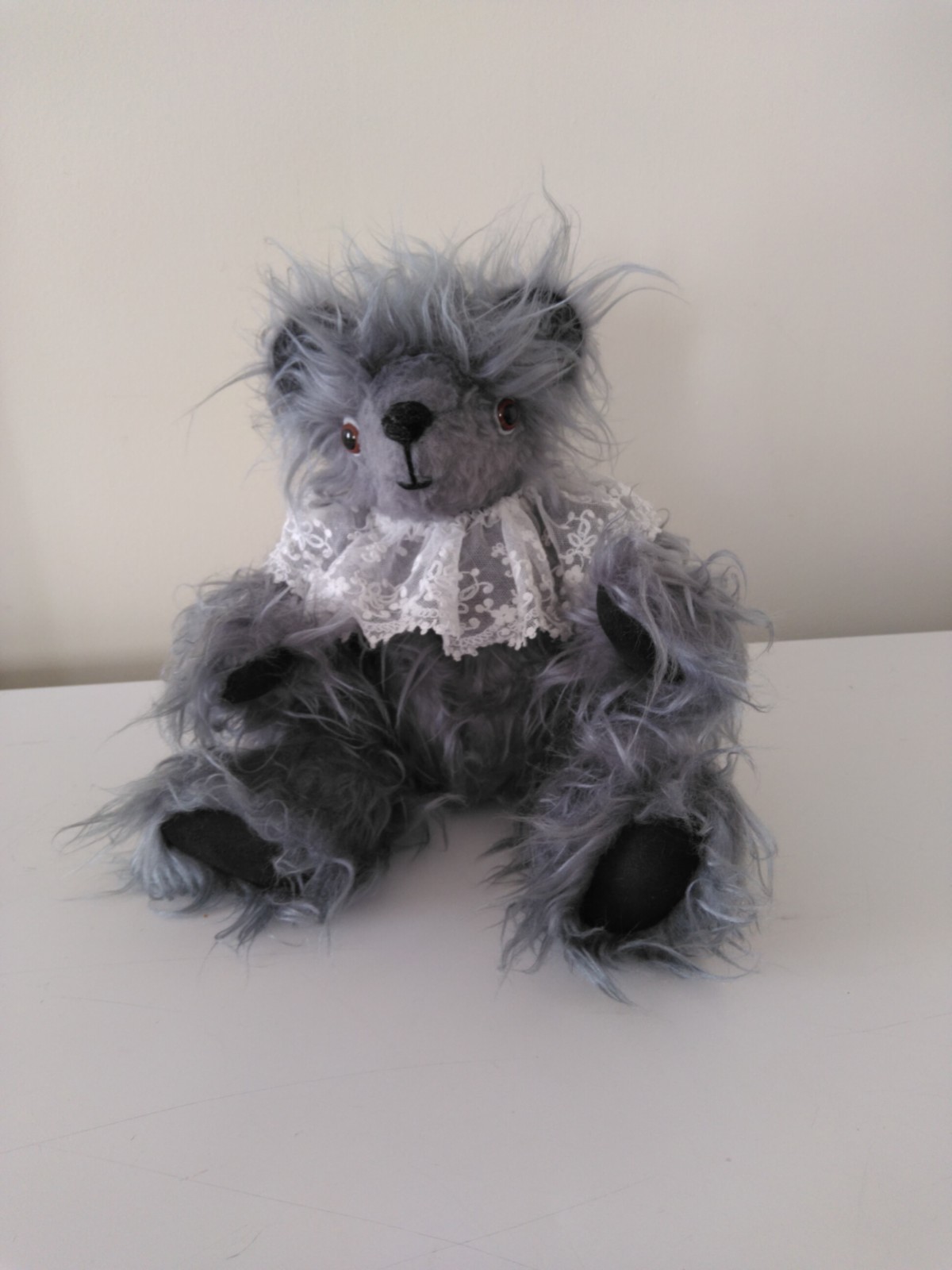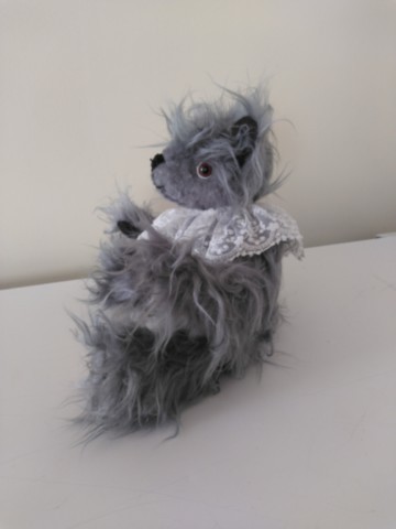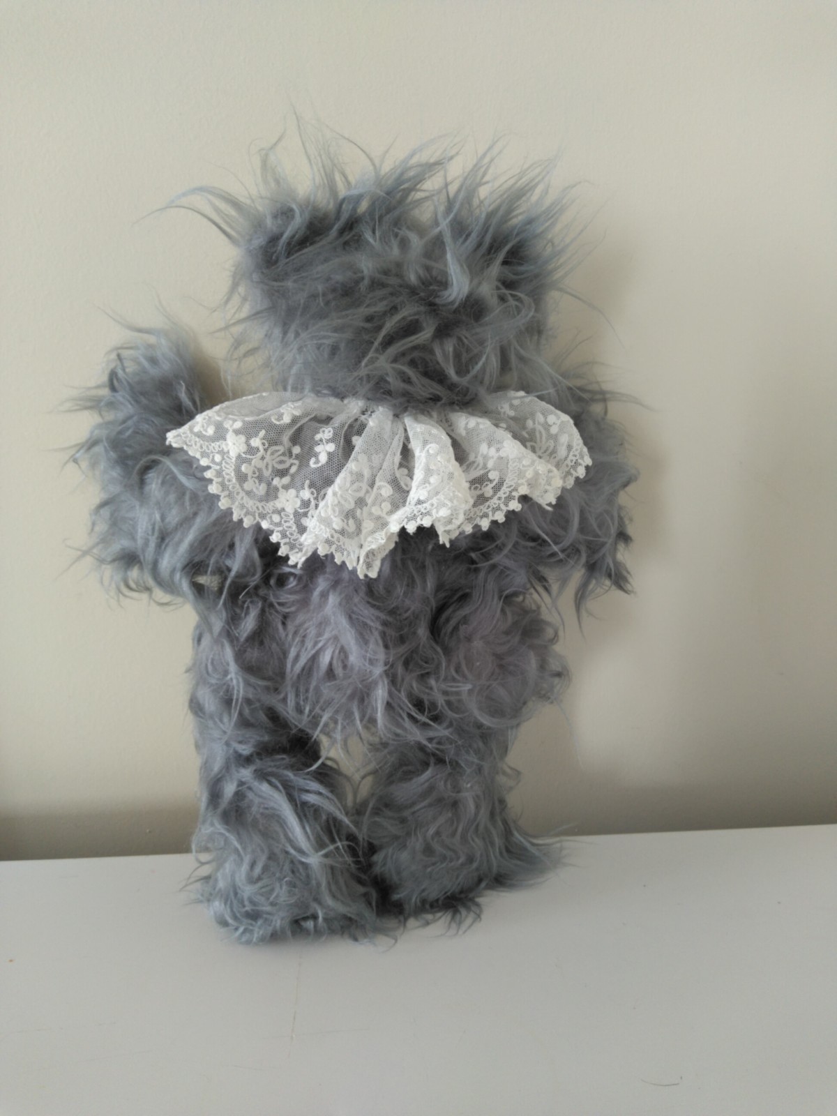 Réalisé à l'ancienne en tissu mohair gris à poils longs et suédine noir de qualité pour les oreilles et l'intérieur des pattes. Entièrement articulé, rembourrage traité anti acariens. Une petite collerette en dentelle ancienne pour agrémenter l'ensemble. Yeux de sécurité et coutures renforcées. Cet ours est entièrement fait à la main de façon artisanal.