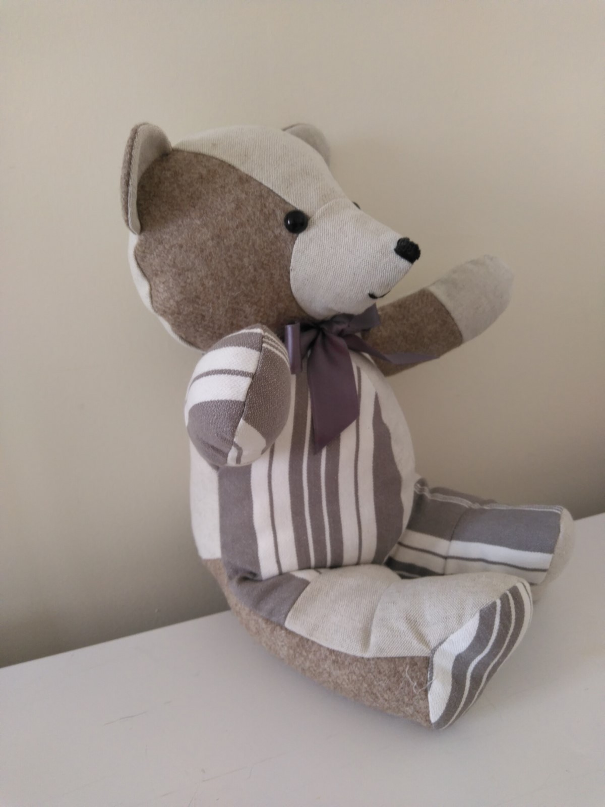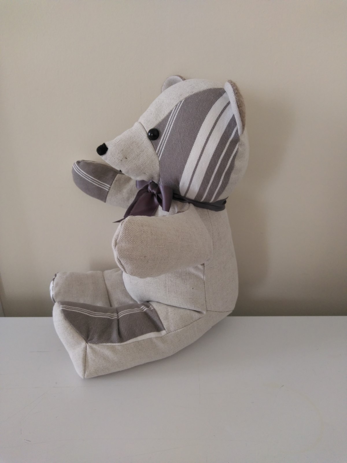 Réalisé avec des tissus lin, feutre et coutil rayé. Le mélange des matières et de couleurs le rend original et unique. Les yeux sont des yeux de sécurité noir, le nez et la bouche sont brodés. Le rembourrage est traité anti acariens. Noeud bordeaux. Les coutures sont doublées pour plus de sécurité. Adapté aux enfants. Fait mains