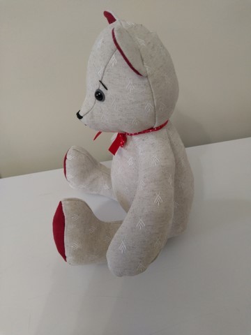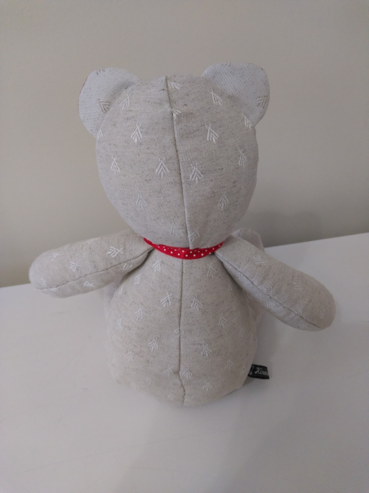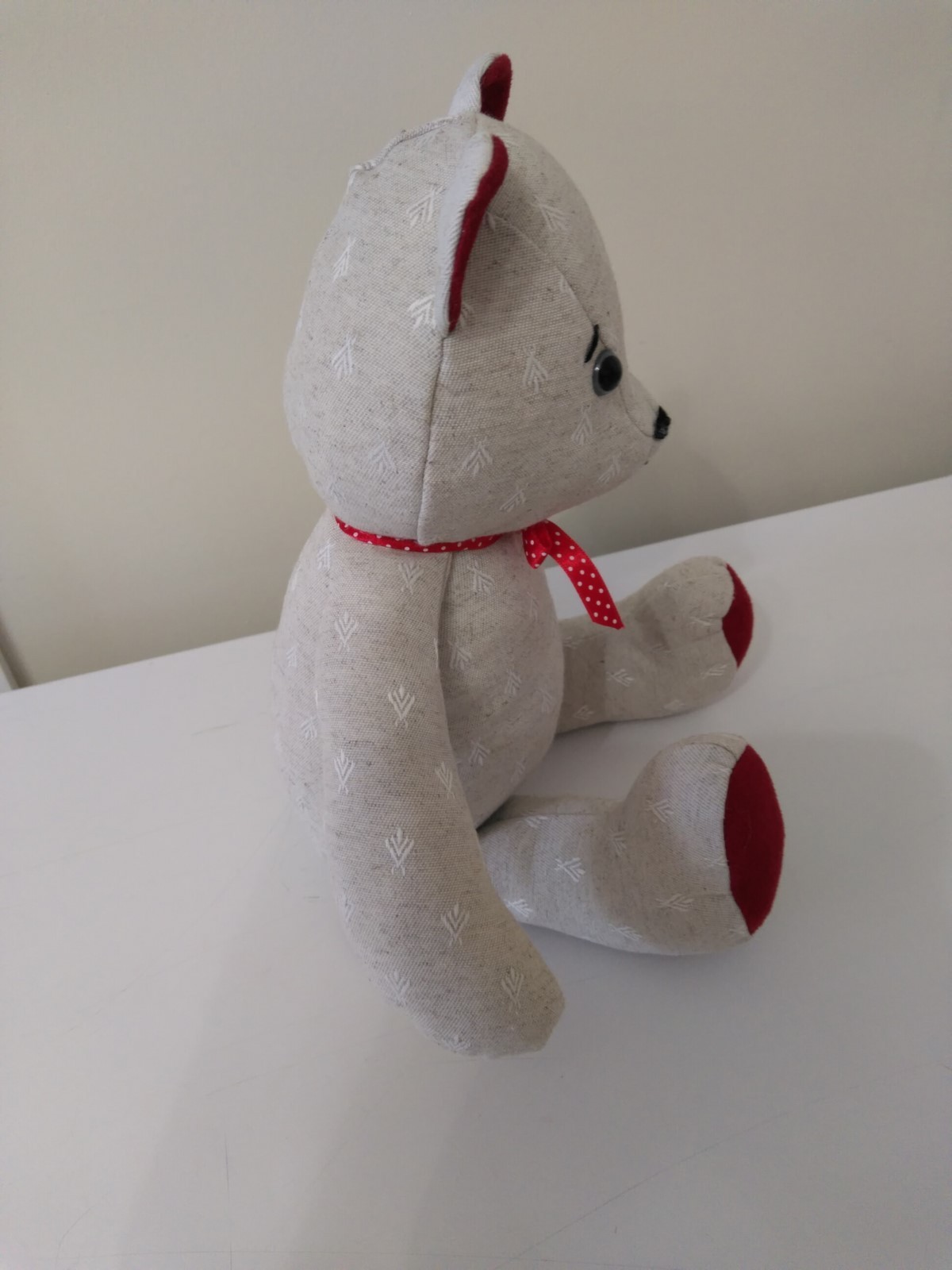 Jacquard abeille écru et suédine rouge pour les dessous de pattes et les oreilles. Petit noeud satin rouge. Le nez et la bouche sont brodés. Yeux de sécurité gris bleu. Le rembourrage est traité anti acariens et les coutures sont doublées pour plus de solidité. Adapté aux enfants. Fait mains.