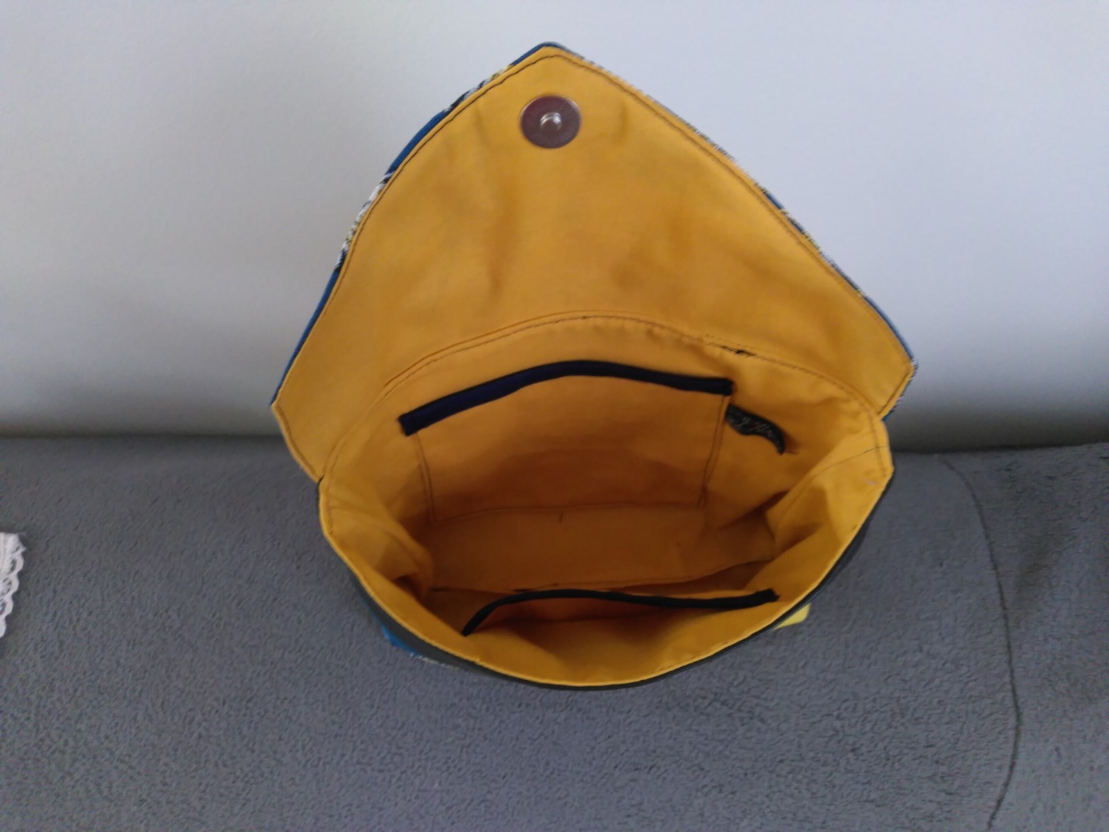 Réalisée avec un tissu jacquard imprimé Ginko bleu et suédine noire. Contraste cuir jaune et jacquard Ginko. Fermeture magnétique. Finition passepoil cuir bleu. Doublure intérieure coton jaune. Deux petites poches intérieures. Fait mains.
