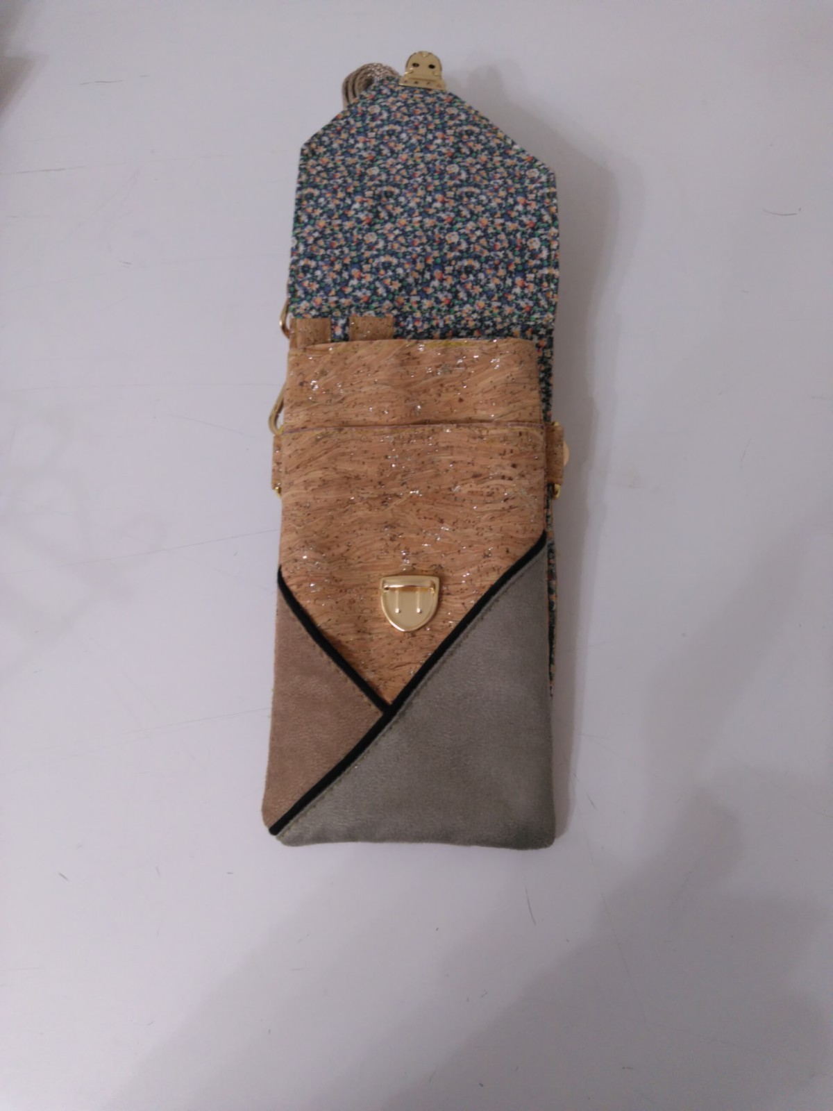 Réalisée en liège pailleté, suédines beige et taupe et doublure coton liberty. Fermeture cartable dorée et pression de sécurité pour le portable.Finition passepoil noir. Porte carte et porte monnaie intégrés. Fait mains