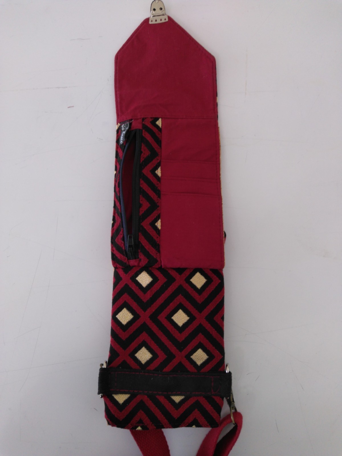 Réalisé en tissu jacquard noir rouge et or, suédine noire et liège pailletée or. Doublure coton rouge et finition passepoils noir et rouge. Fermeture cartable métal argent. Anse réglable. Pression de sécurité pour le portable. Porte cartes et porte monnaie intégrés. Fait mains.