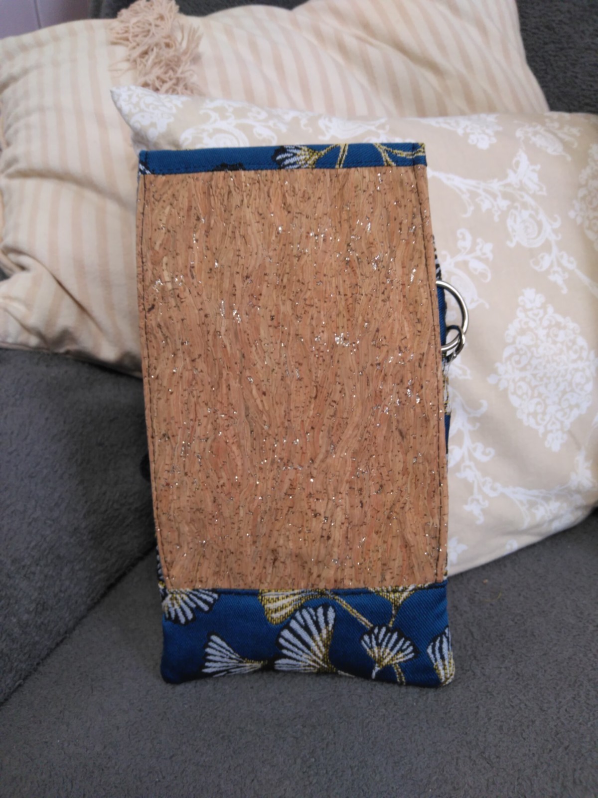 Réalisée en tissus jacquard Ginko bleu, liège pailleté et suédine noire. Doublure coton gris et pression de sécurité pour le portable. Finition passepoils et fermeture cartable bronze. Porte cartes et porte monnaie intégré. Anse réglable. Fait mains.
