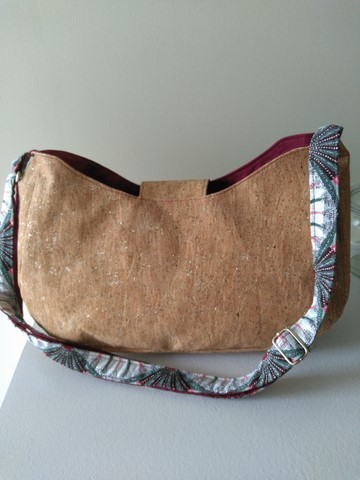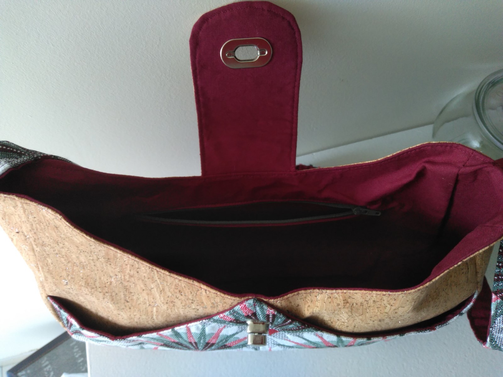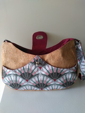 Réalisé en tissu jacquard éventails lurex argent et liège pailleté or. La doublure intérieure est en coton rouge bordeaux. Une patte avec fermeture tourniquet ferme le sac. La anse est réglable. Le sac comporte une poche intérieure ainsi que deux autres extérieure sur le devant. Les coutures sont renforcées pour plus de solidité. Fait mains.