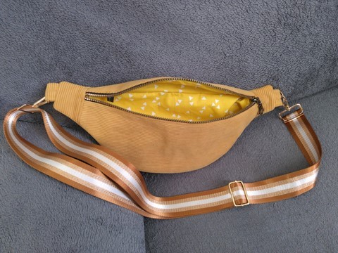 Réalisé en tissu côtelé jaune, zip fantaisie métal bronze. Doublure coton jaune imprimé triangles. Sangle bronze et écrue réglable. Coutures renforcées. Travail artisanal. Fait mains.