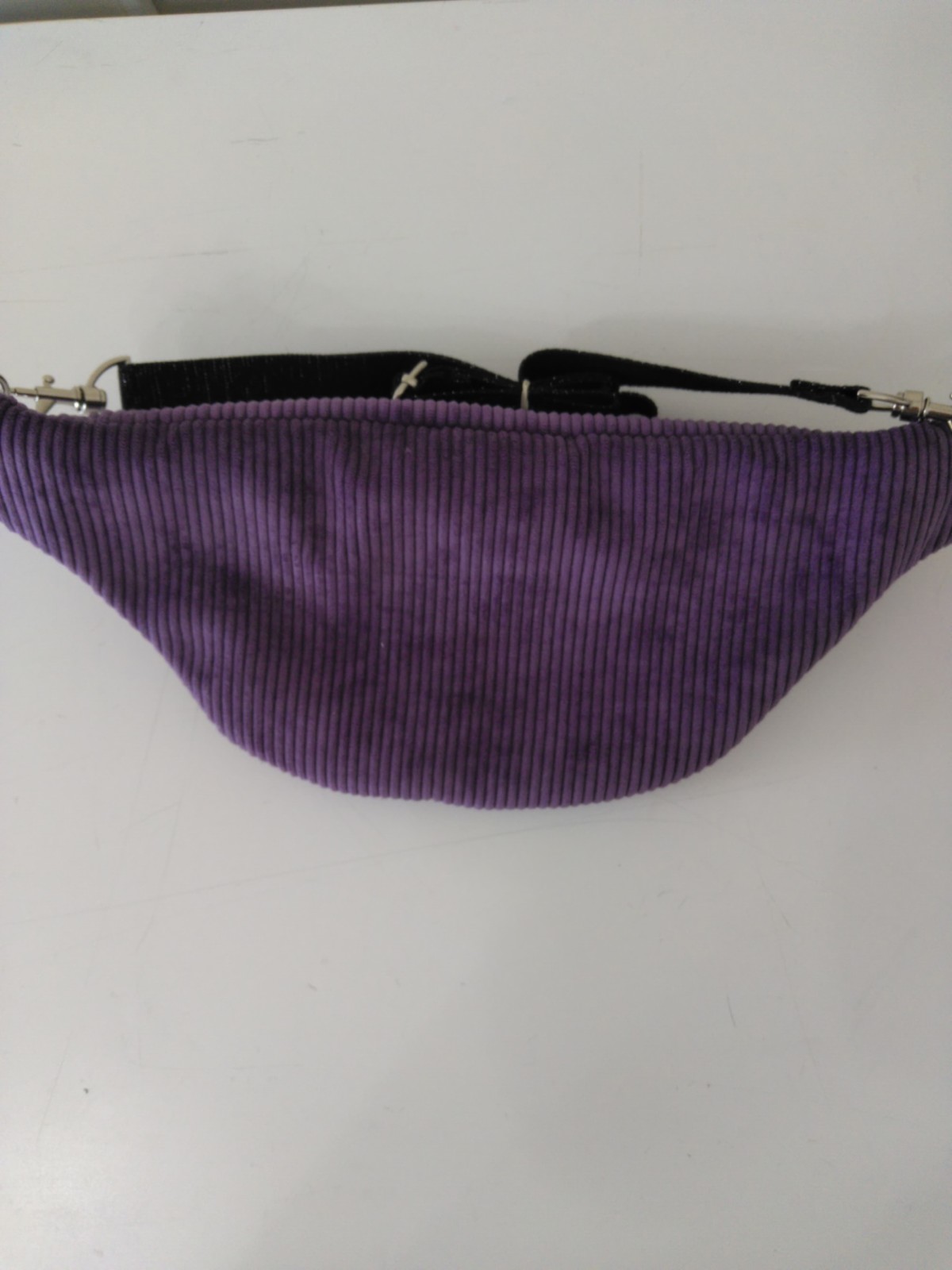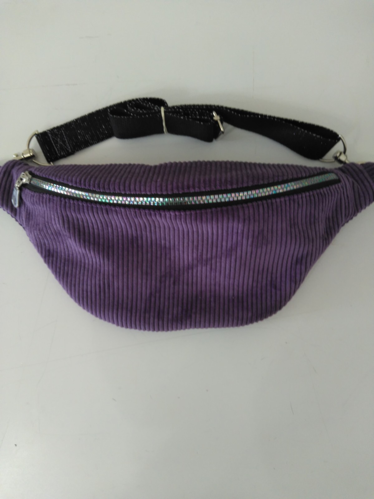 Réalisé en tissu velours côtelélie de vin, zip fantaisie irisé. Doublure coton imprimé rose et blanc. Sangle réglable coton noir pailletée. Coutures renforcées. Travail artisanal. Fait mains.