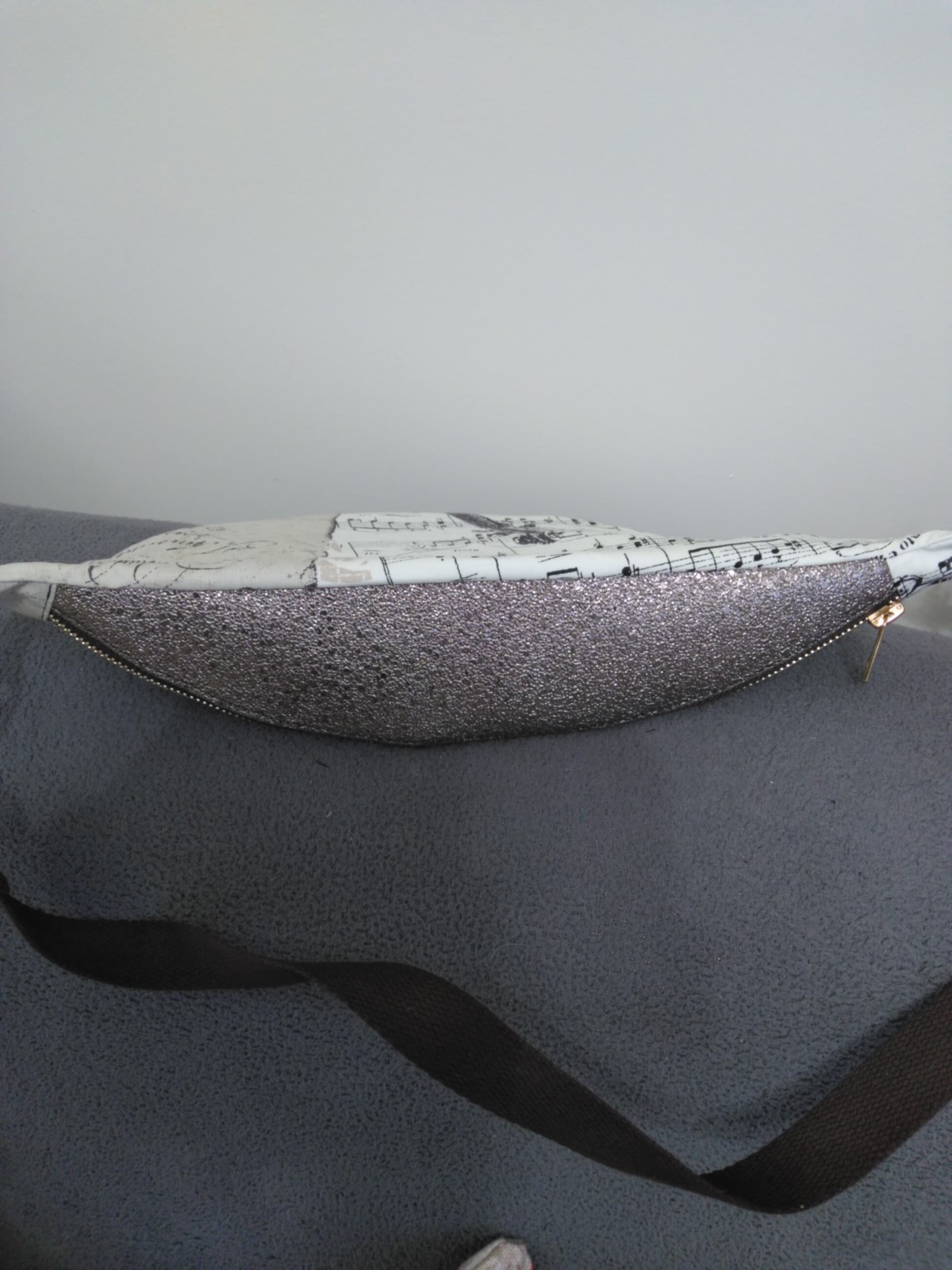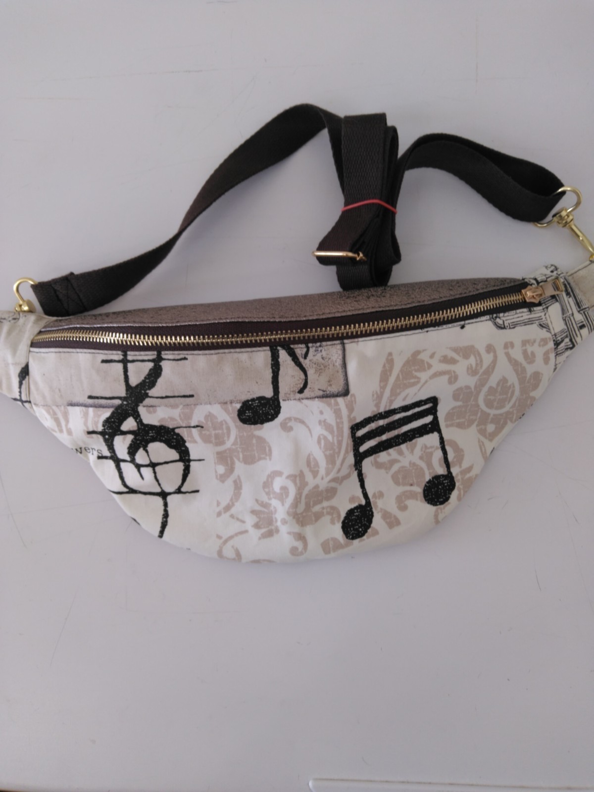 Réalisé en tissu bâchette notes de musique et simili cuir doré pour le rabat, zip fantaisie doré. Doublure coton taupe. Sangle coton noire réglable. Coutures renforcées. Travail artisanal. Fait mains.
