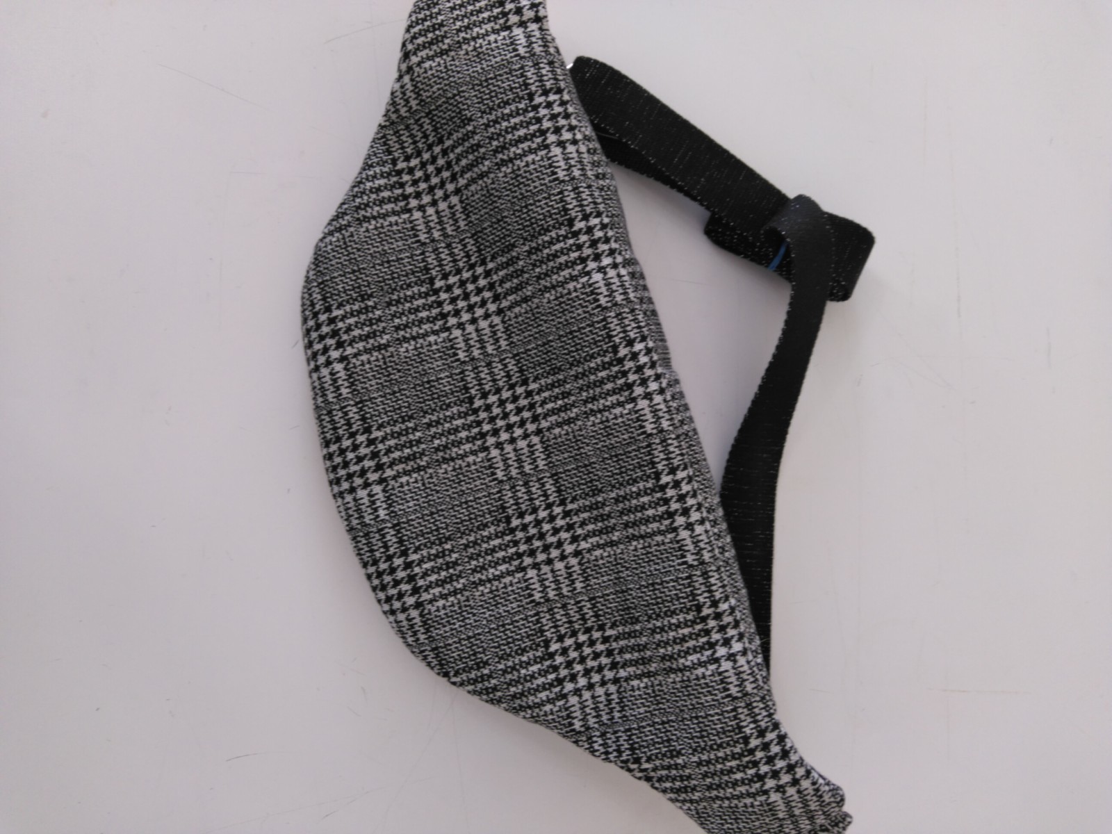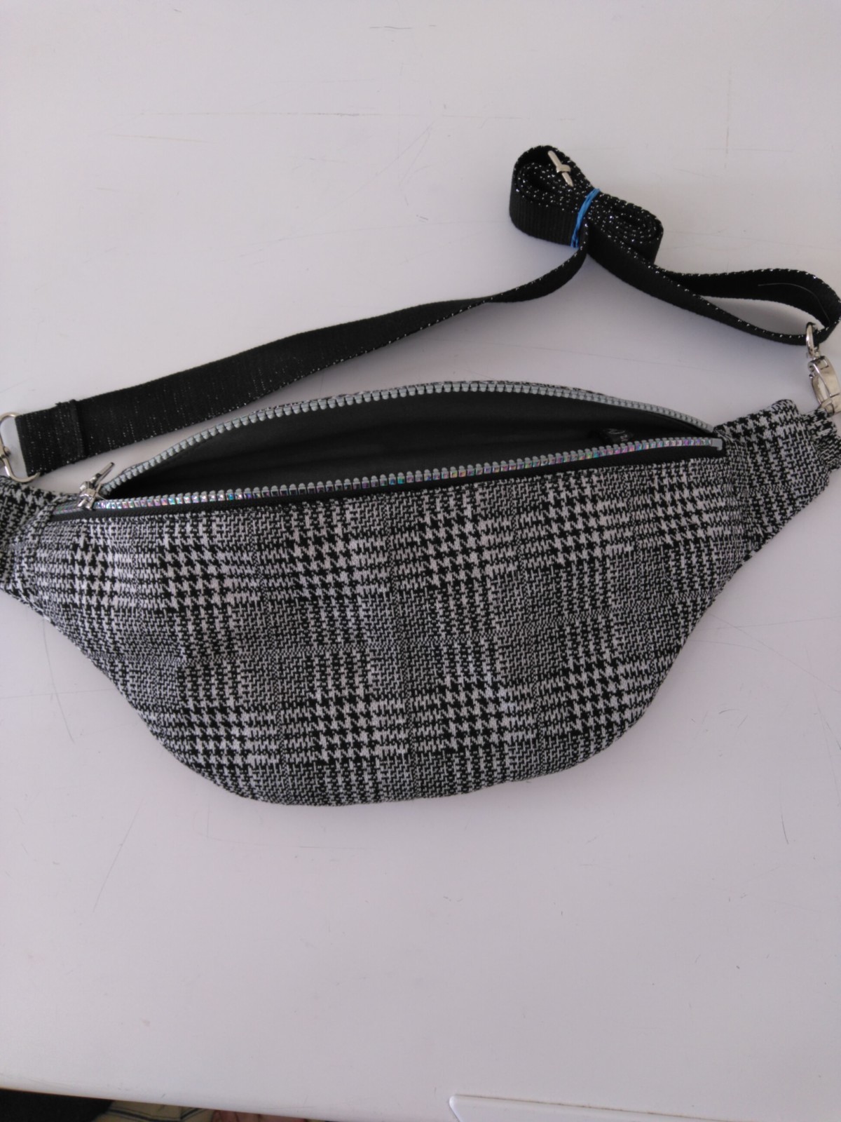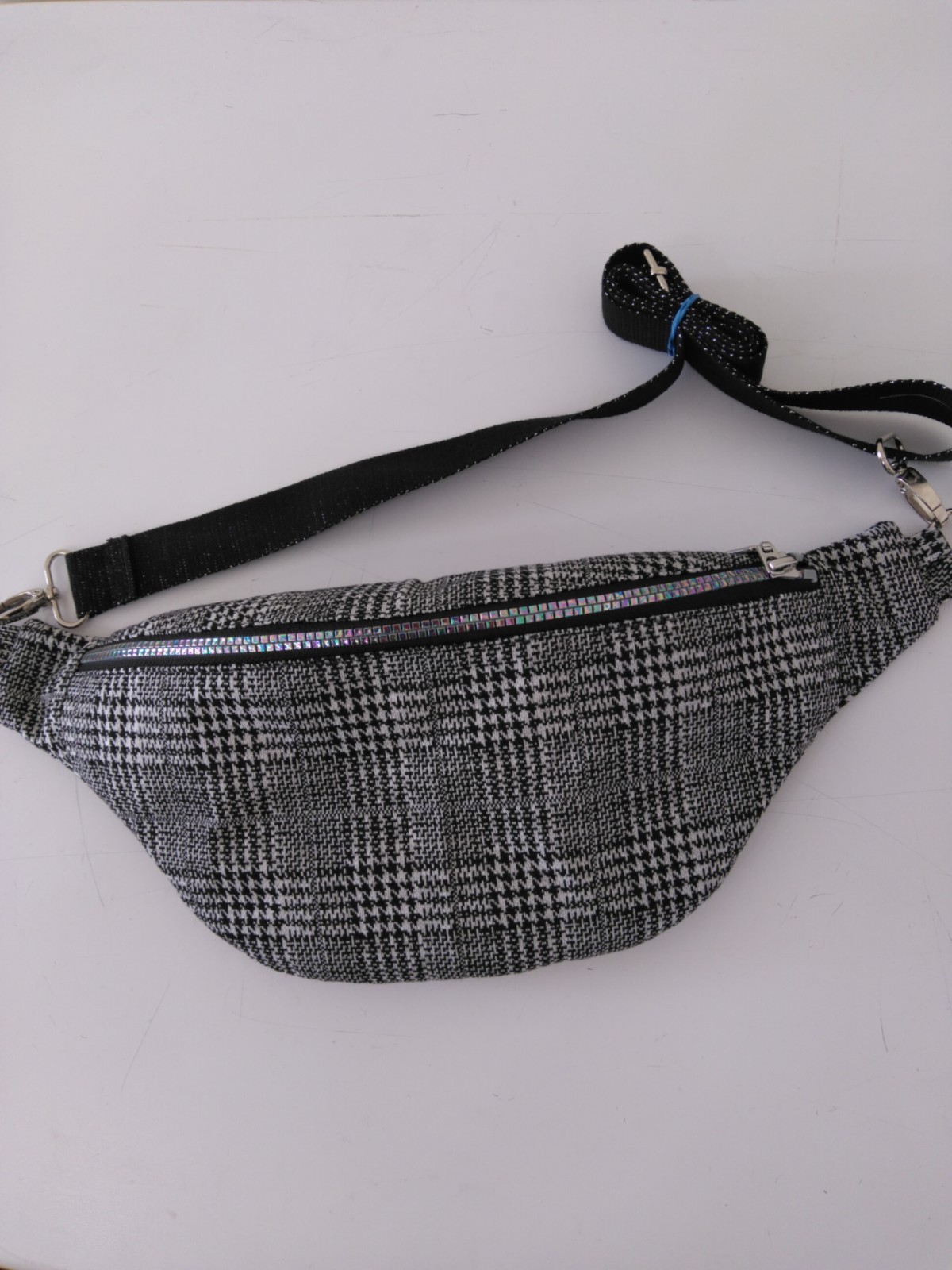 Réalisé en tissu Prince de Galles, zip fantaisie irisé. Doublure coton gris. Sangle noire pailletée réglable. Coutures renforcées. Travail artisanal. Fait mains.
