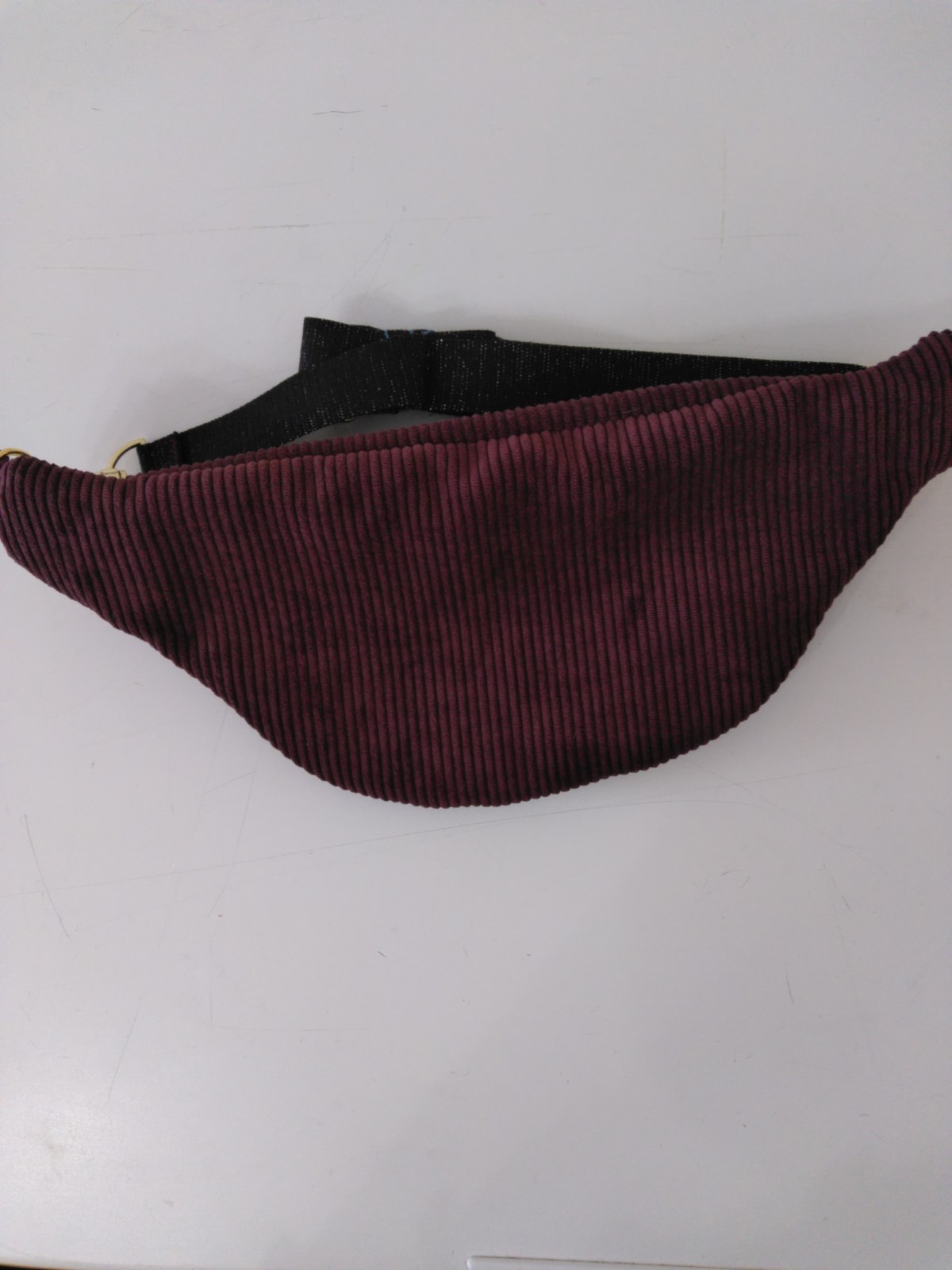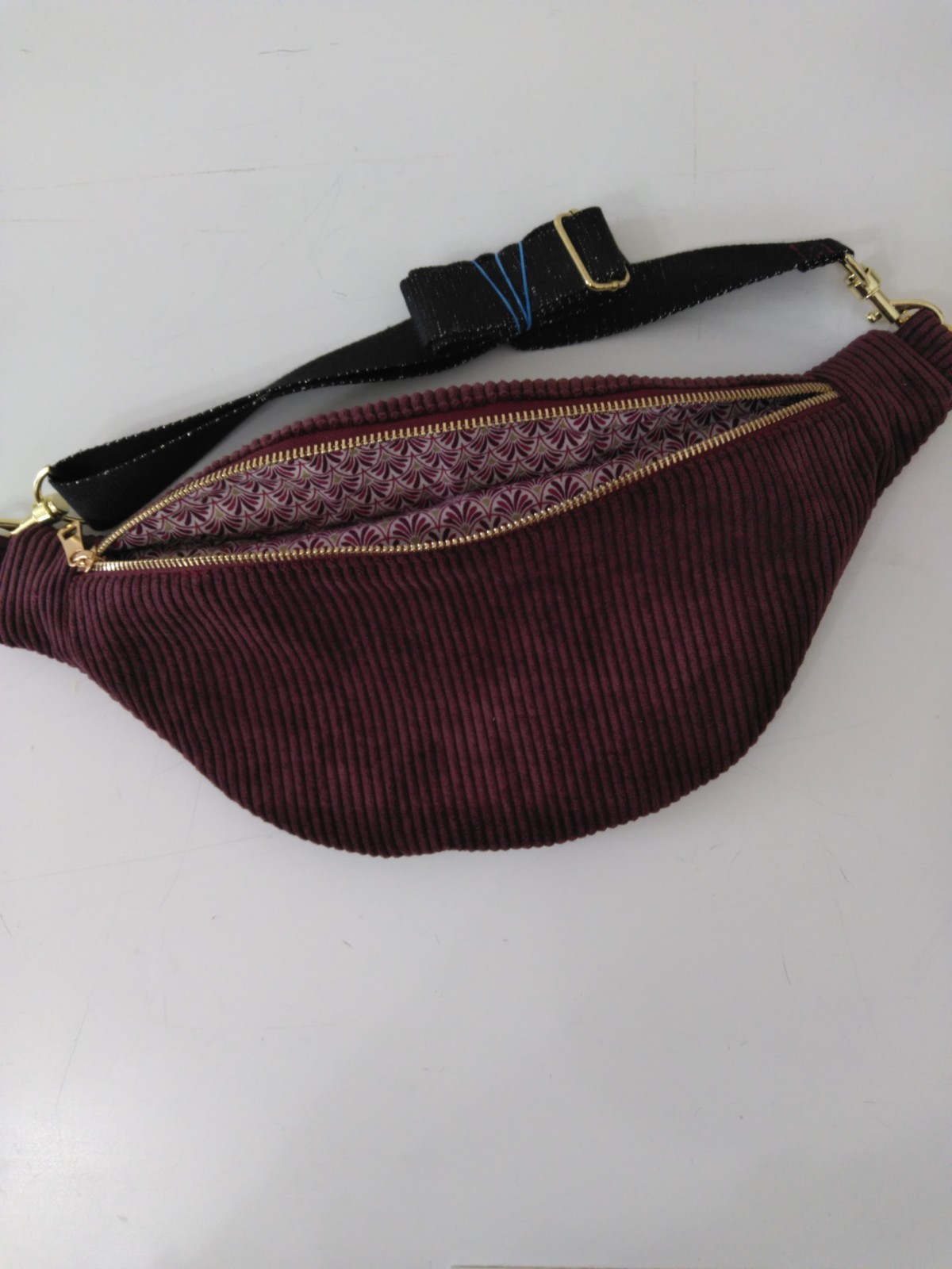 Réalisé en tissu velours côtelé prune, zip fantaisie doré. Doublure coton imprimé éventails bordeaux. Sangle réglable coton noir pailletée. Coutures renforcées. Travail artisanal. Fait mains.