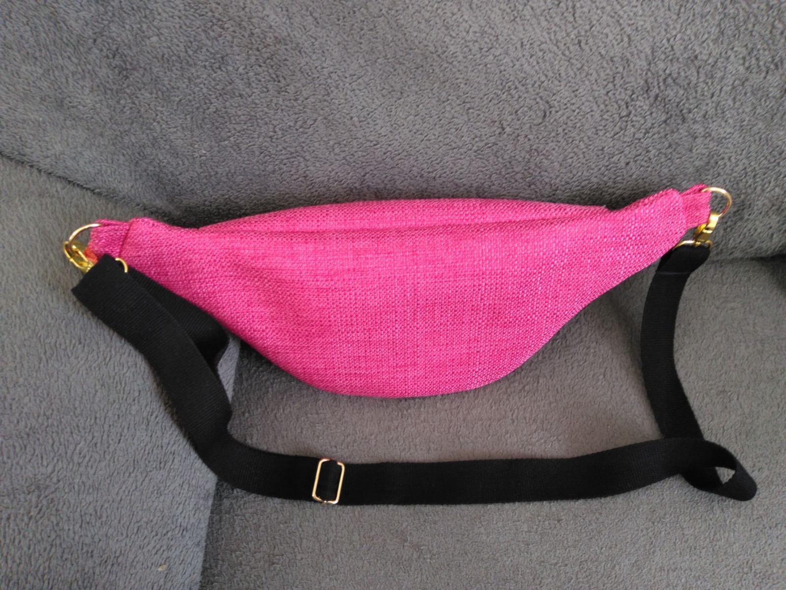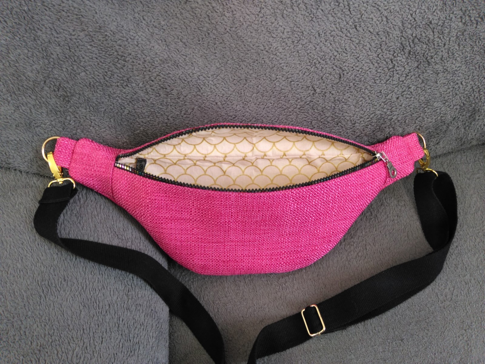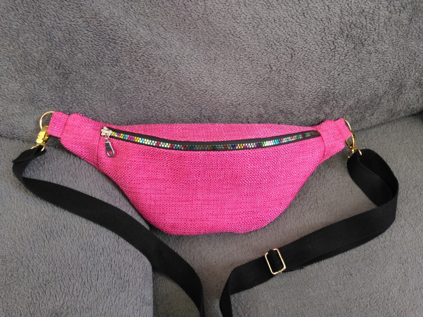 Réalisé en tissu jacquard rose. Doublure écru demi-cercles or. Zip fantaisie multicolore et sangle réglable noire. Les coutures sont renforcées pour plus de solidité. Travail artisanal. Fait mains.