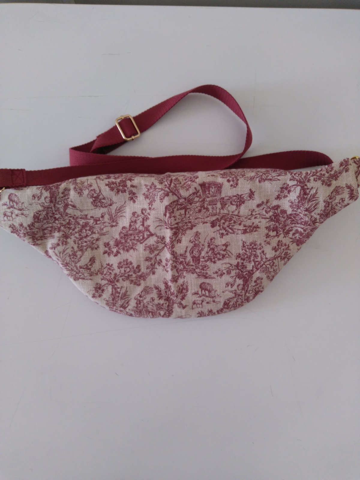 Réalisé en tissu toile de jouy rouge, zip fantaisie bordeaux et doré. Doublure coton rouge. Sangle coton rouge réglable. Coutures renforcées. Travail artisanal. Fait mains.
