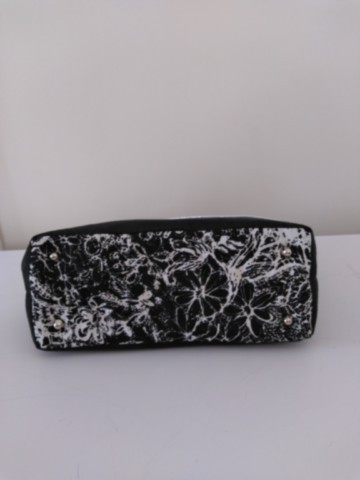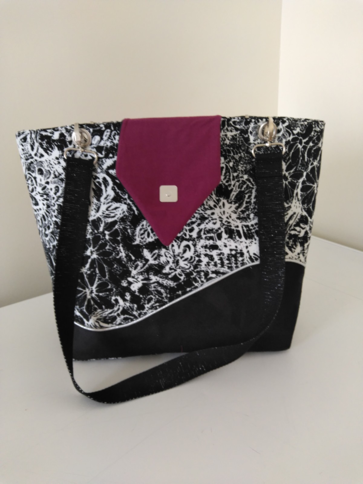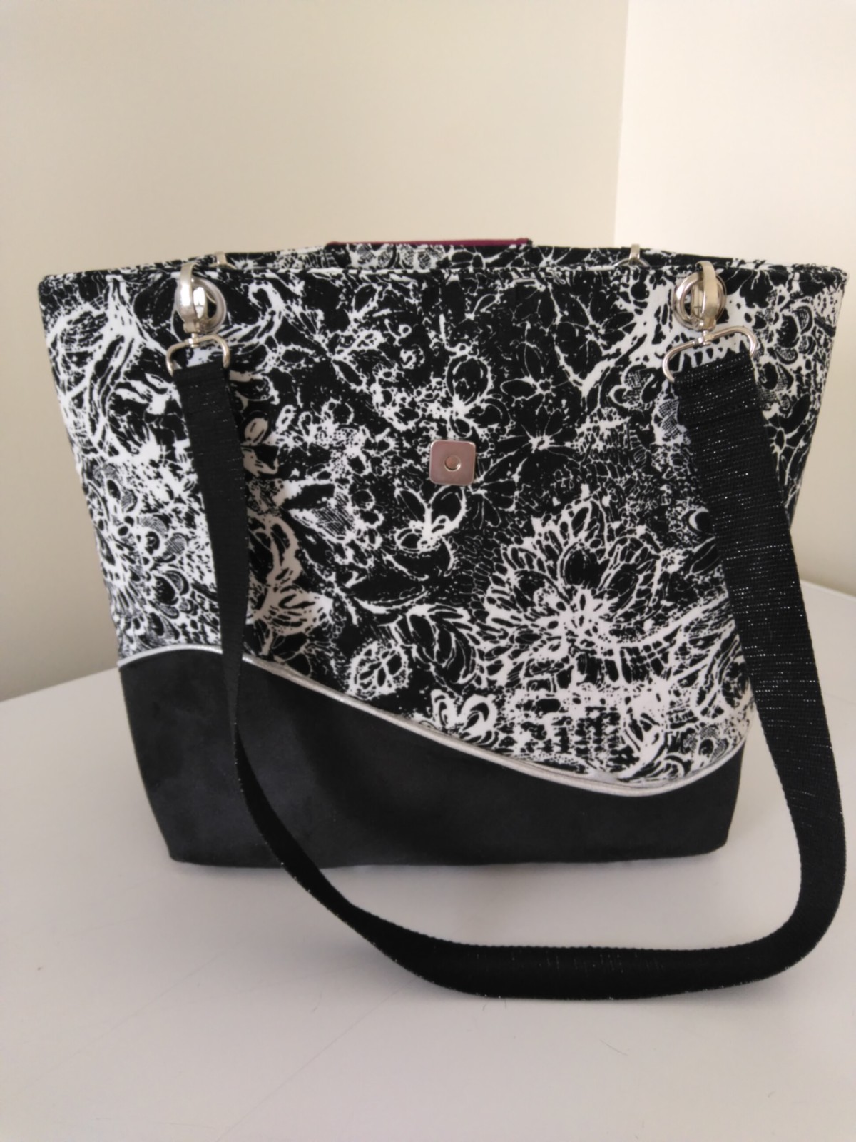 Réalisé en velours noir et blanc et suédine noire. Doublure coton bordeaux. Finitions passepoil lurex argent . Bouclerie métal argent. Le sac comprend 4 poches intérieures. Une mousse résille entre les tissus permet un bon maintien du sac.Pieds de sac métal argent. Pour les anses j'ai mis une sangle coton pailletée lurex argent. Travail artisanal. Fait mains