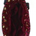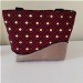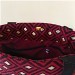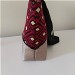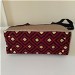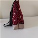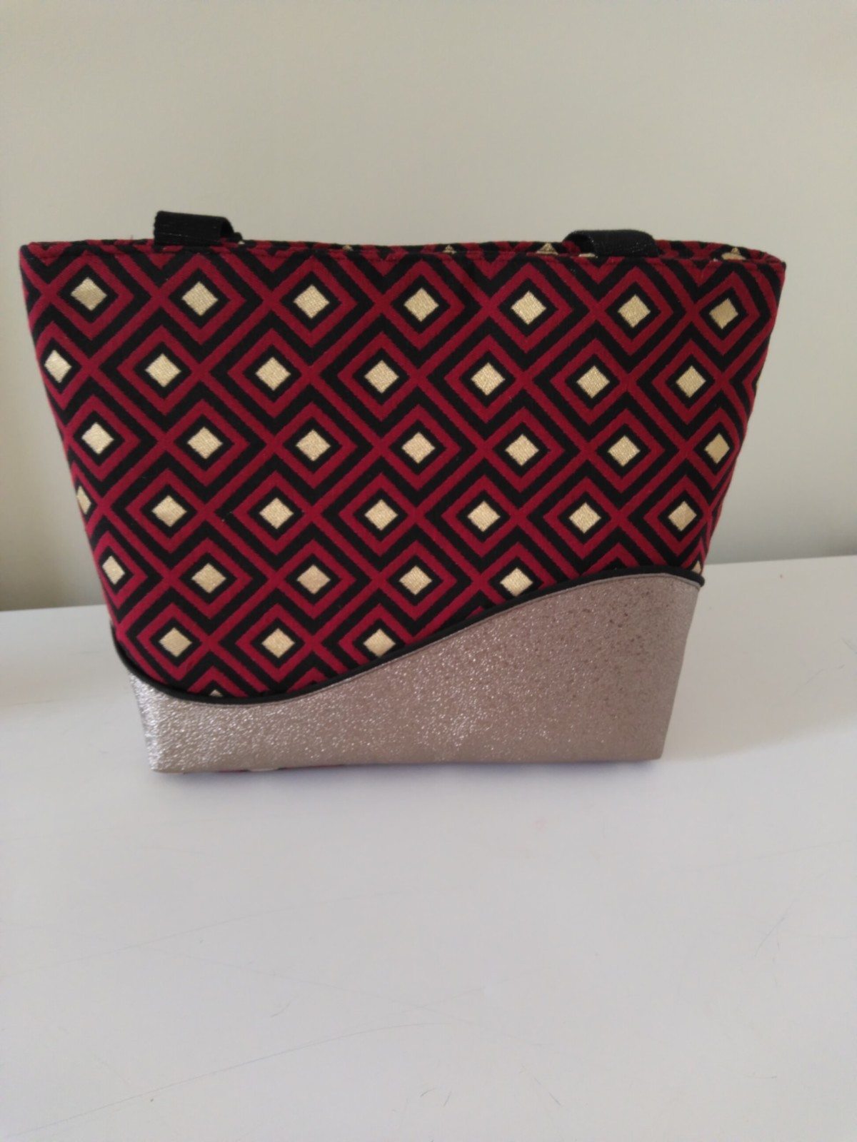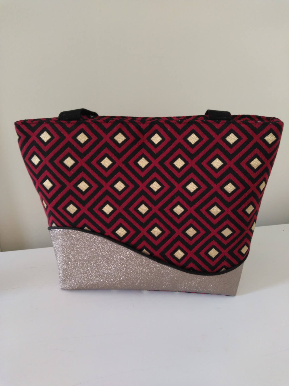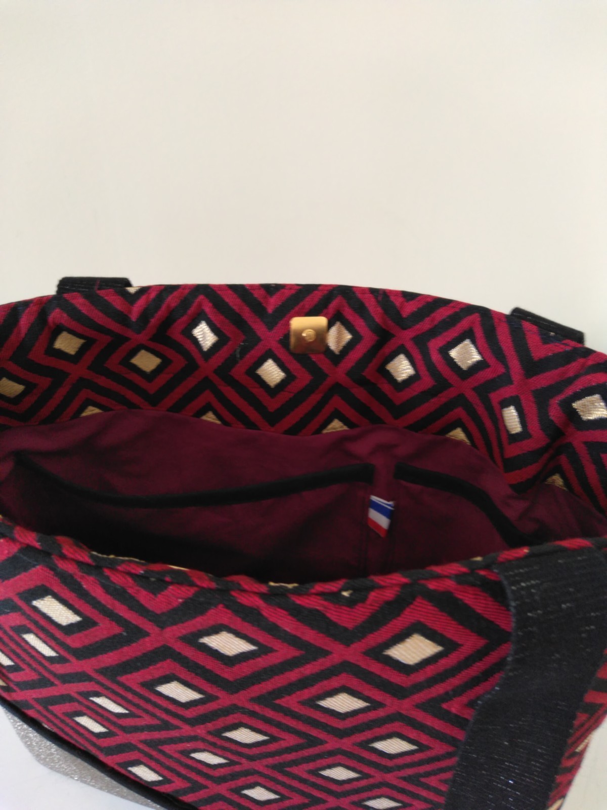 Réalisé en tissu jacquard géométrie rouge et lurex or et simili relief or. La doublure est en coton bordeaux. Le sac comporte 6 poches intérieure. Pieds de sac. Anses coton noir pailletée lurex or. Finitions passepoil noir. Travail artisanal. Fait mains