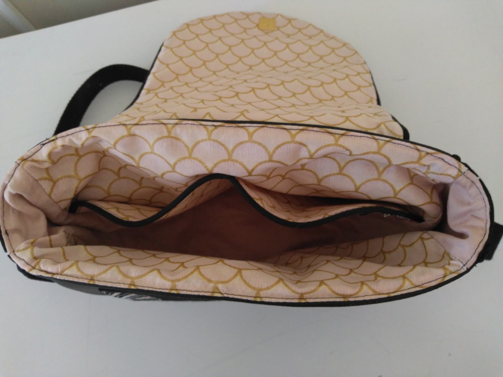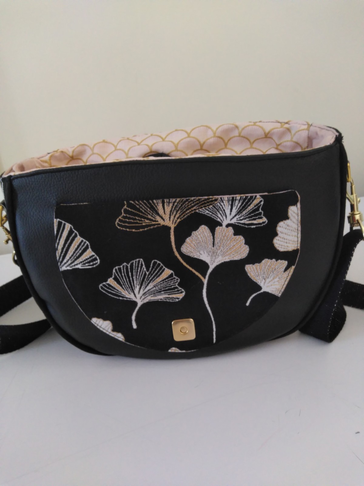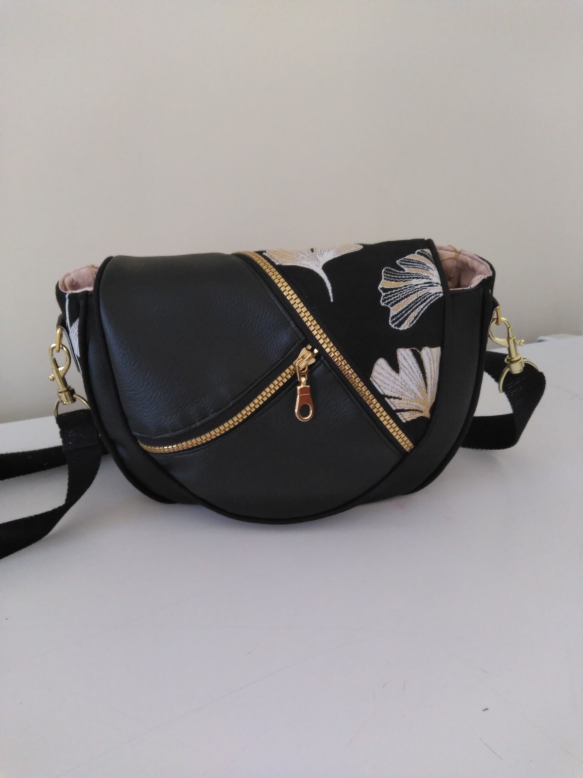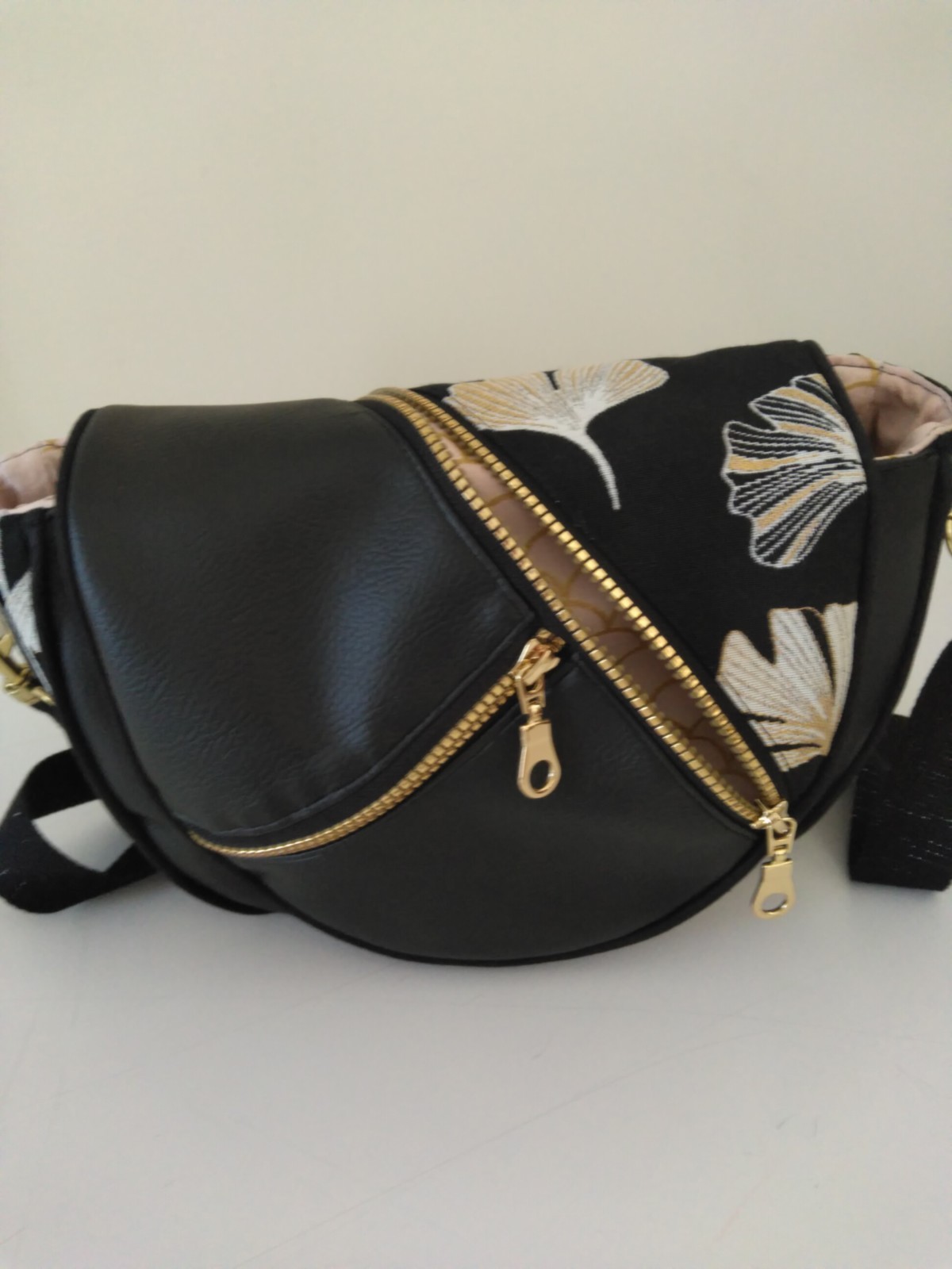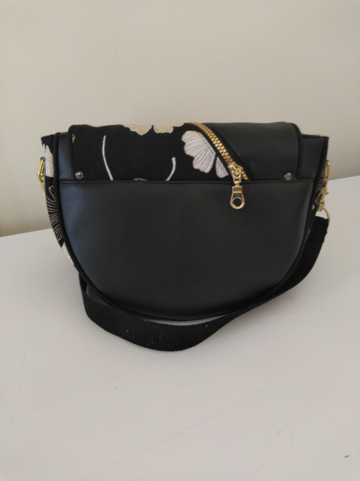 Réalisé en jacquard imprimé Ginko et simili cuir noir. La doublure est en coton imprimé demi-cercles. Il comprend 3 poches intérieures, une poche plaquée sur le devant du sac et une poche zippée sur le rabat du sac. Finitions passepoil noir. Bouclerie métal doré. La sangle en coton noire pailletée lurex or est réglable. Coutures renforcées. Travail artisanal. Fait mains.