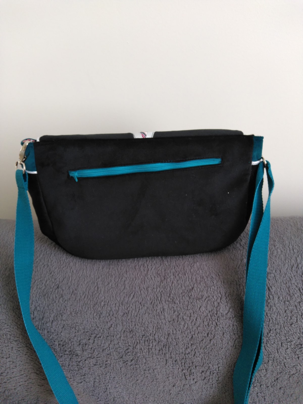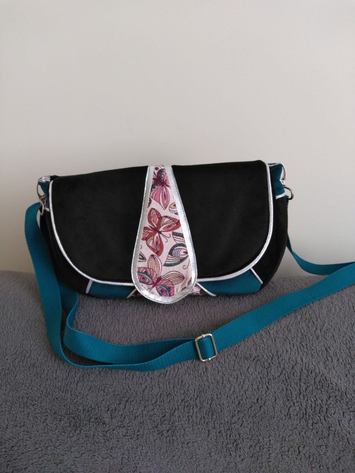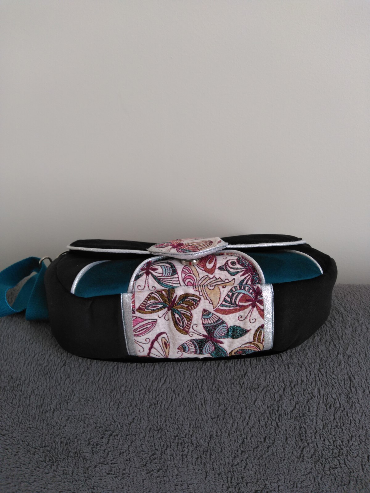 Réalisé avec des tissus velours noirs et bleu canard, un tissu jacquard imprimé papillons et tissu coton bleu pour la doublure. Ce sac comporte 5 poches. 3 poches à soufflets et une poche zippée à l'intérieur et une poche asymétrique zippée au dos du sac. La bandoulière est réglable. La fermeture du sac se fait par bouton magnétique. Les coutures sont renforcées pour la solidité et pour une meilleur tenue du sac, j'ai inséré une mousse résille thermocollante entre les tissus principaux et la doublure. Les finitions, passepoil et biais sont en lurex argenté. Fait main.