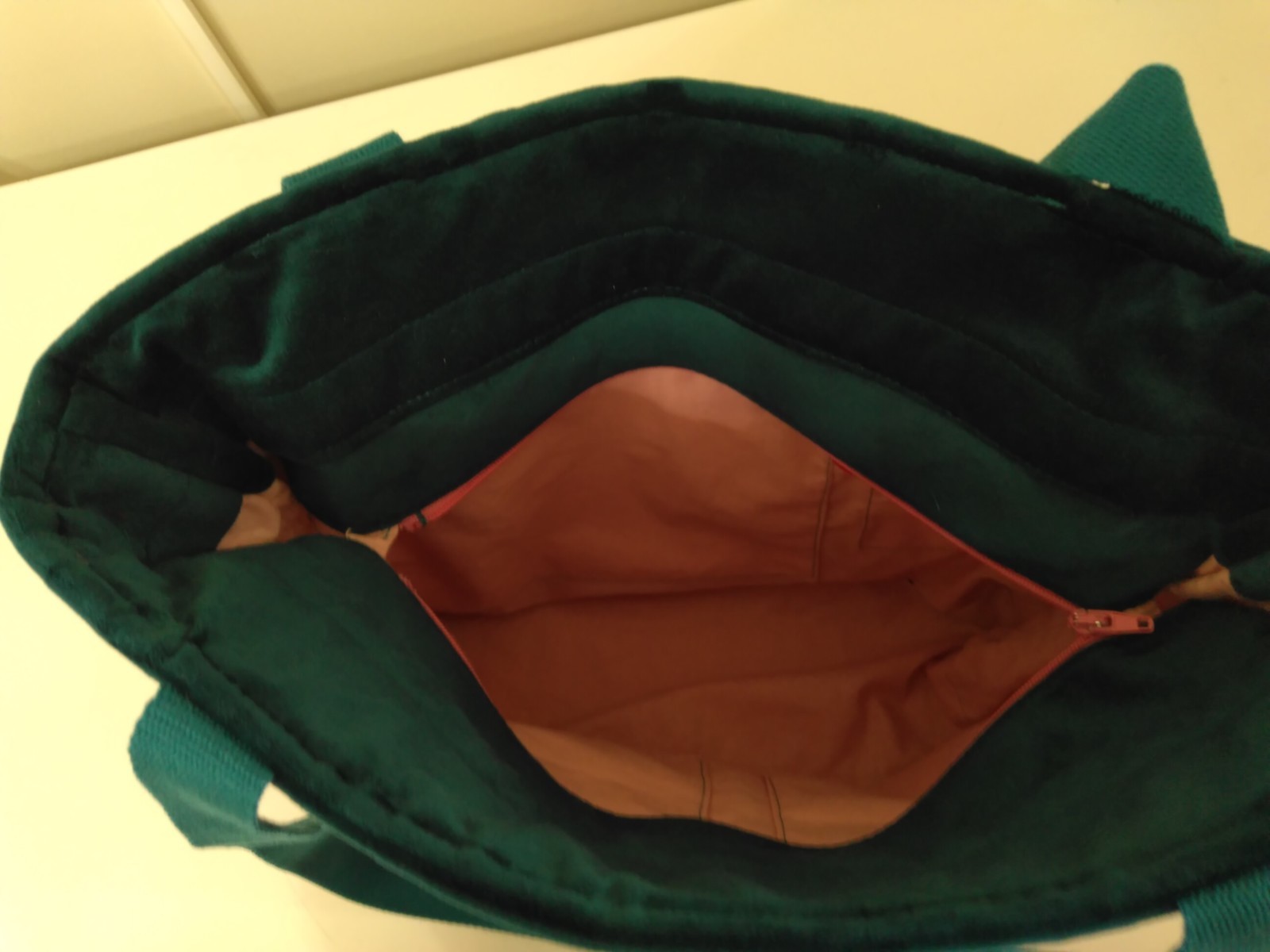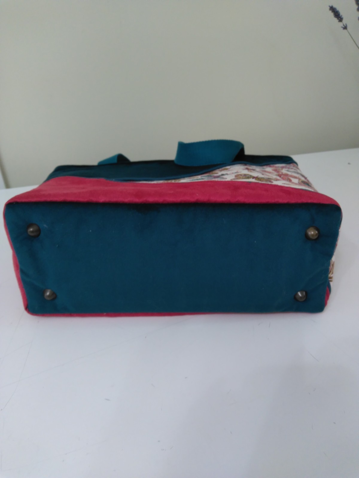 Réalisé dans un tissu jacquard imprimé papillon, velours bleu canard et suédine framboise. Finitions passepoil bleu canard. La doublure est en coton rose. il comporte 6 poches intérieure. Les anses sont en coton bleu canard pailletées. Des pieds de sac ont été ajouté. Travail artisanal. Fait mains.