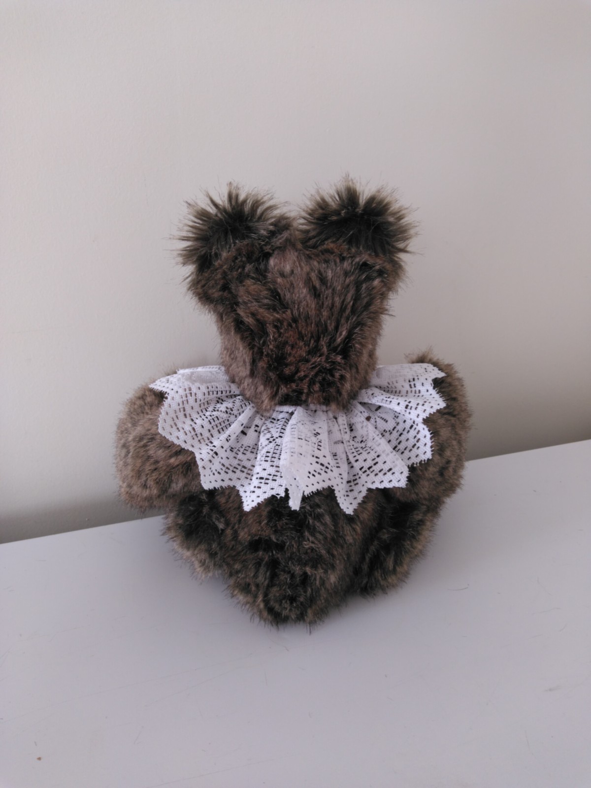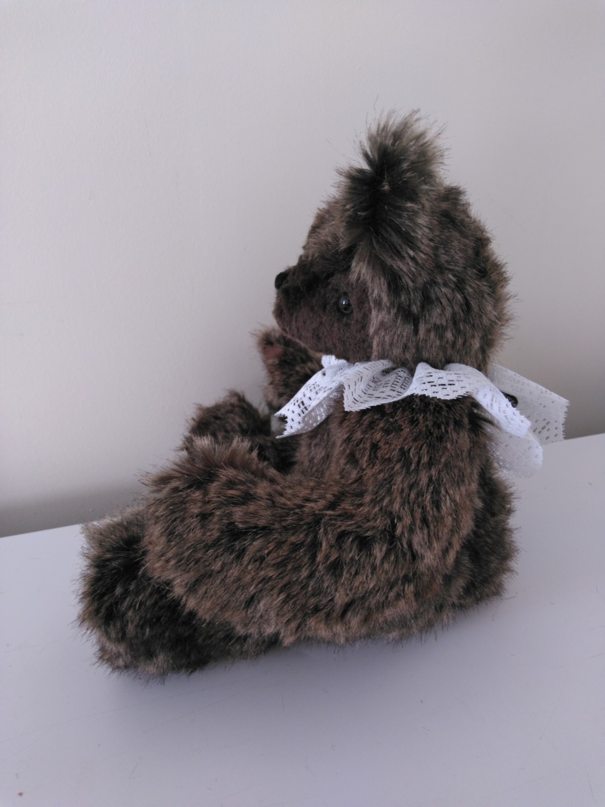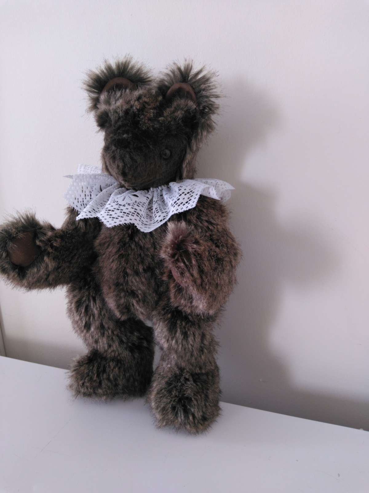 Réalisé en vison vintage (datant des années 50) et suédine de qualité pour les dessous de pattes. Le rembourrage est traité anti acariens. J'ai réalisé une petite collerettte en dentelle et brodé le nez. Fait entièrement à la mains avec des métodes anciennes et la tête, les bras et les jambes sont articulées à l'ancienne. Cet ours est une pièce unique. Travail artisanal.