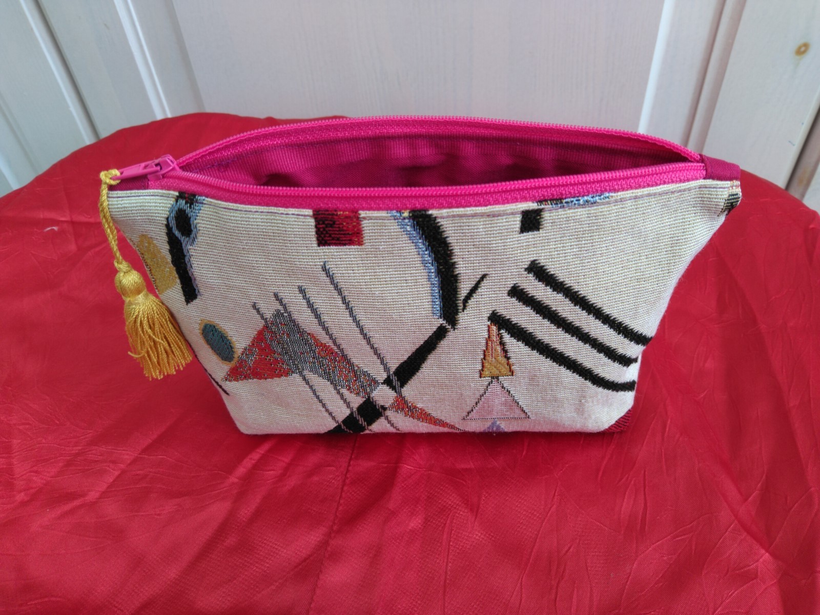 Réalisée dans un tissu jacquard "abstrait" multicolore. La doublure intérieure et le zip sont de couleur fushia, le pompon est jaune. Les coutures sont renforcées pour la solidité. Fait mains