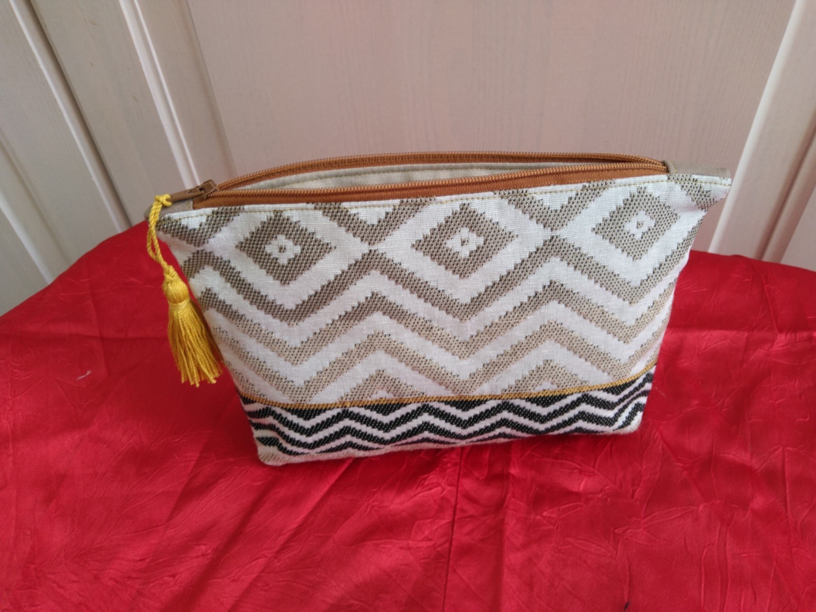 Réalisée dans un tissu jacquard "géométrie taupe". Zip jaune, pompon gris et doublure taupe. Les coutures sont renforcées pour la solidité. Fait mains