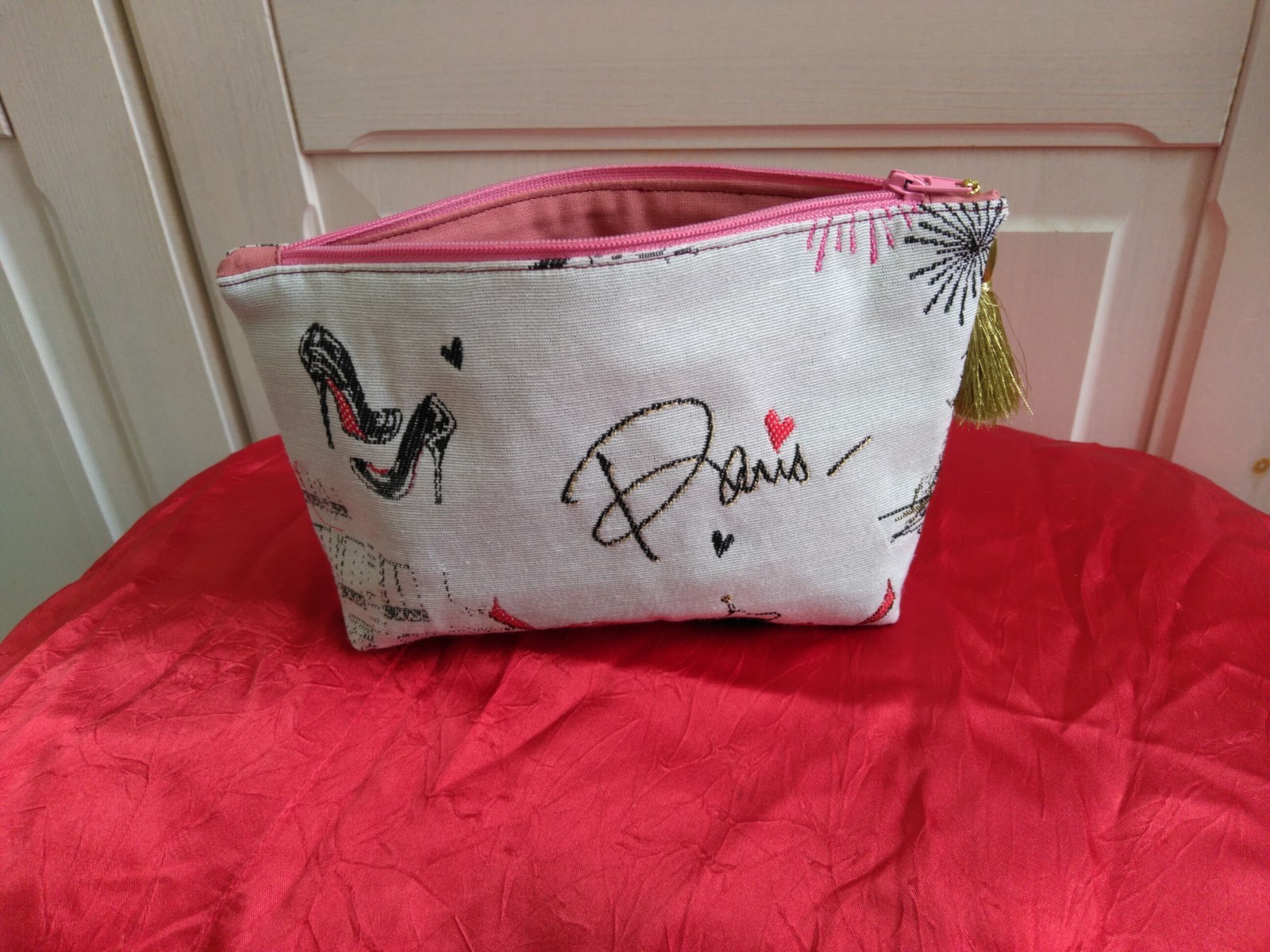 Réalisée en tissu jacquard "Paris". Zip et doublure roses. Pompon doré. Coutures renforcées pour la solidité. Fait mains