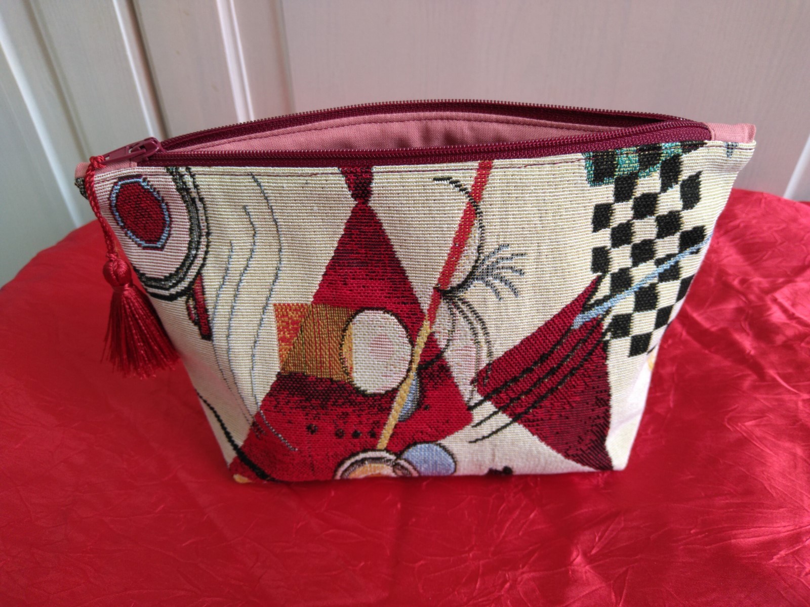 Réalisées en tissu jacquard "Abstrait". La doublure est en coton vieux rose, le zip et le pompon sont de couleur rouge. Les coutures sont renforcées pour la solidité. Fait mains.